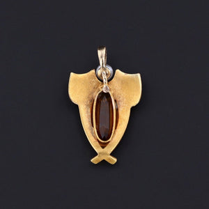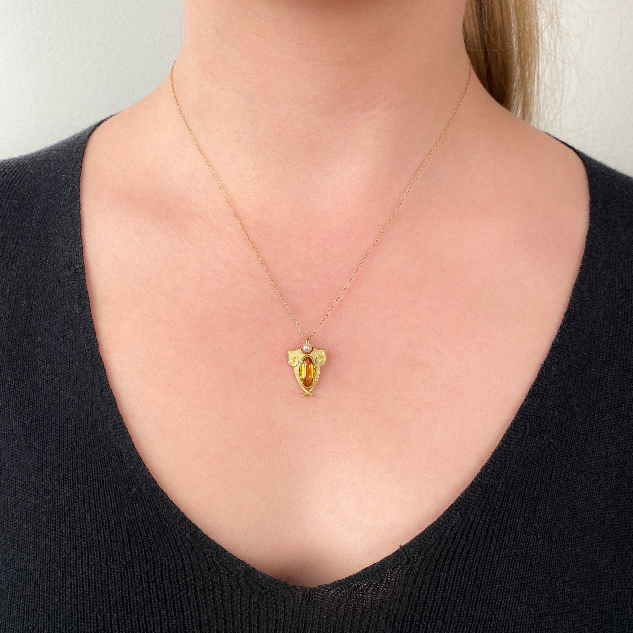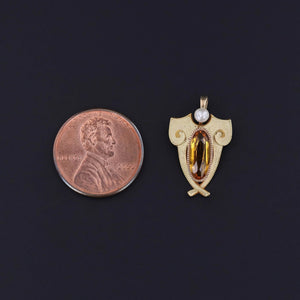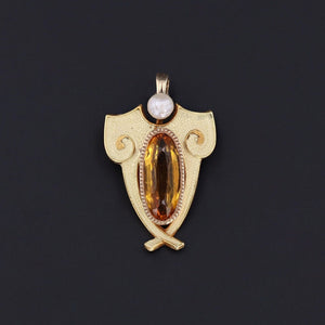 Handcrafted in solid 14k gold, the shield-shaped design features a citrine and glass doublet radiating a warm, golden glow at its center, crowned by a lustrous pearl accent. Vibrant enamel detailing enhances the refined silhouette, creating a jewel that beautifully balances strength and elegance.