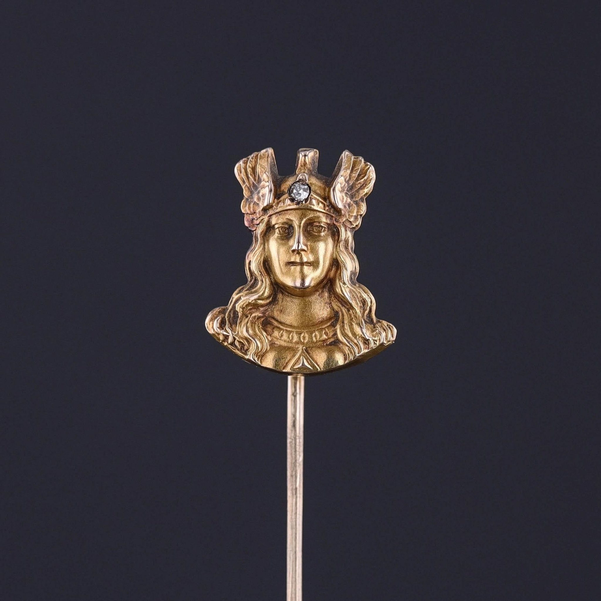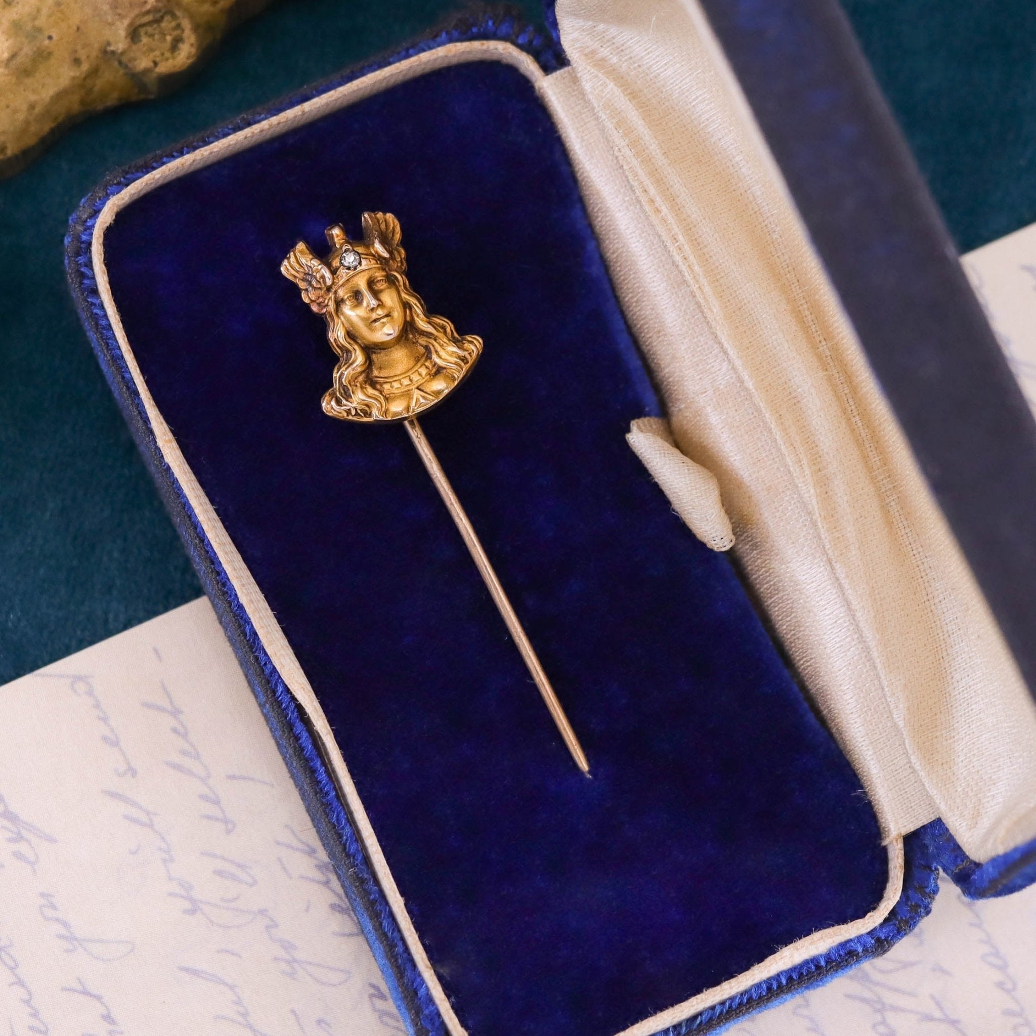 This antique stickpin (circa 1910) features a finely detailed 14k gold rendering of a woman—interpreted as either the Greek goddess Athena, revered for her wisdom and strength, or a Viking maiden, symbolizing courage and resilience. A single diamond set at her crown adds a touch of brilliance, enhancing the regal presence of the design.