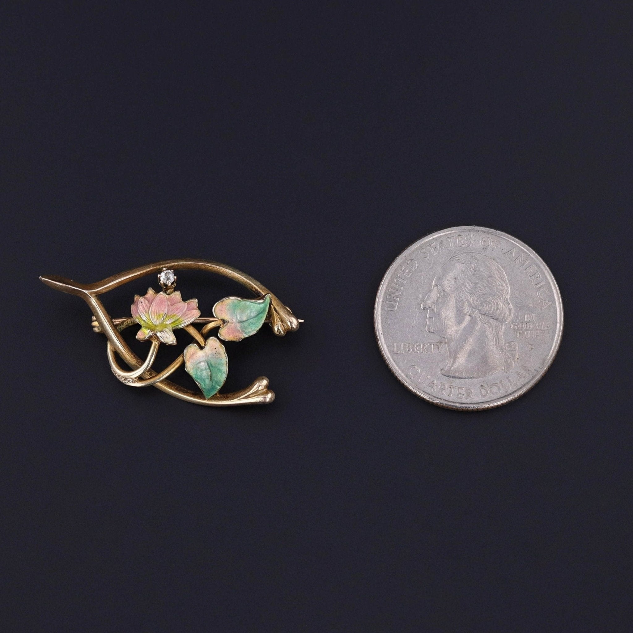 Add a touch of luck and charm to any ensemble with this antique wishbone brooch (circa early 20th century). The 14k gold design features a delicately enameled lily accented by a sparkling diamond, blending natural beauty with symbolic meaning. The wishbone motif, long associated with good fortune and hope, makes this jewel as meaningful as it is elegant.