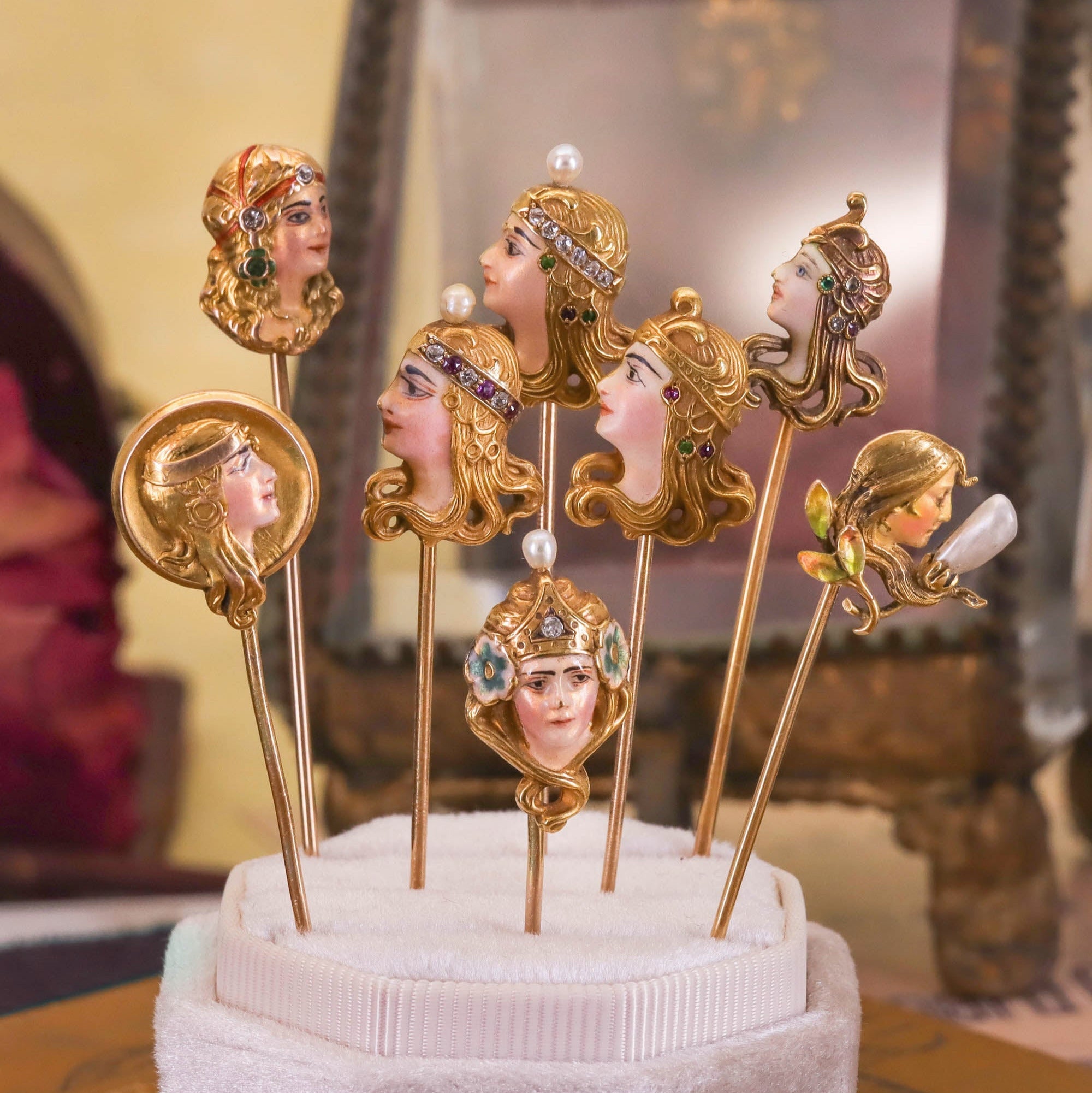 Exquisite in detail, this antique French stickpin (circa 1910) features the finely rendered profile of a woman, her face and headdress decorated with polychrome enamel and accented with precious gemstones: a vivid ruby, a lush emerald, and two glittering diamonds. The artistry reflects the elegance of Art Nouveau design, where naturalism and femininity were central themes.