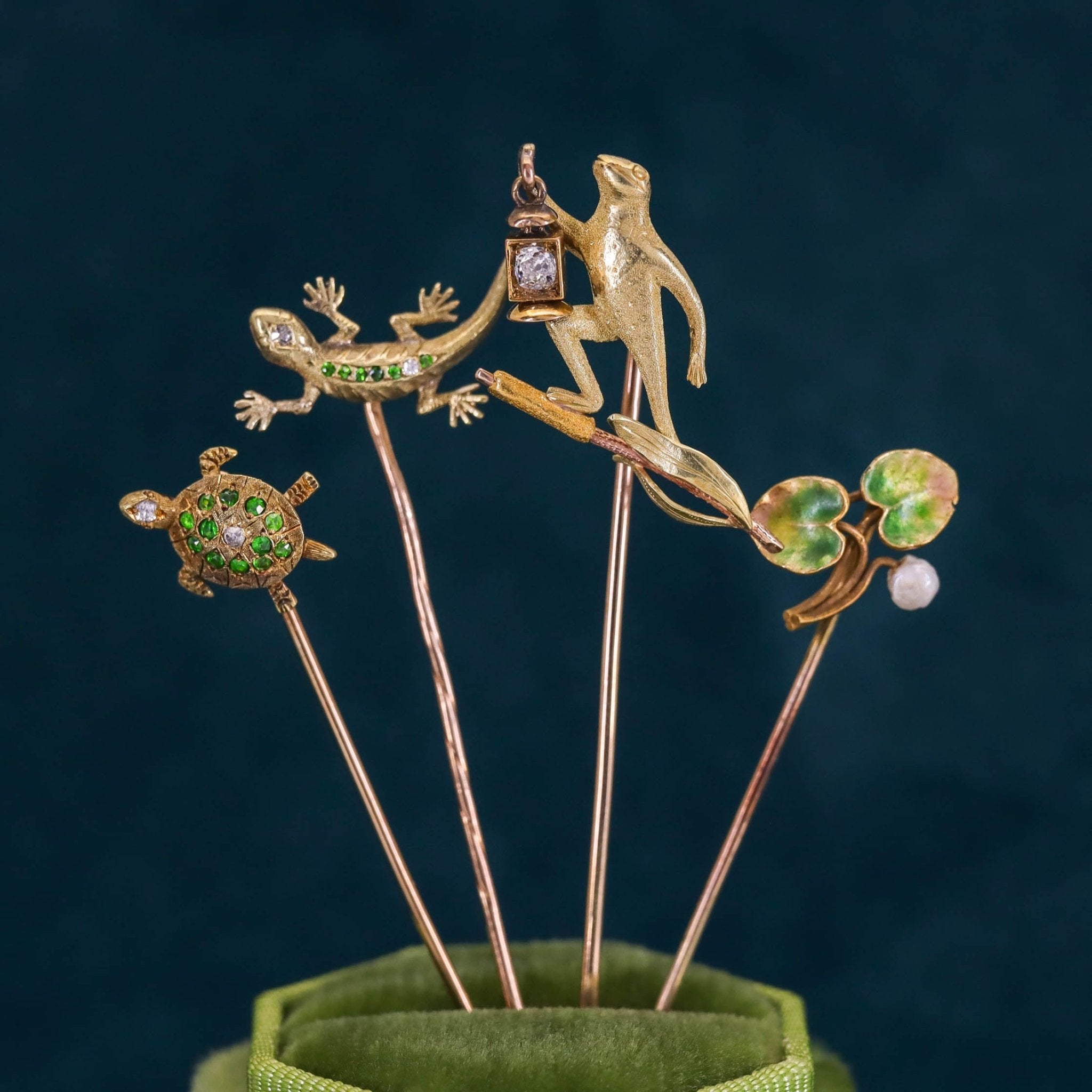 Celebrate the artistry of the late 19th century with this exquisite antique stickpin (circa 1890–1900), featuring a finely modeled turtle in 14k gold. The shell glimmers with vibrant green demantoid garnets—renowned for their brilliance and rarity—while two sparkling diamonds accent the design with refined elegance.