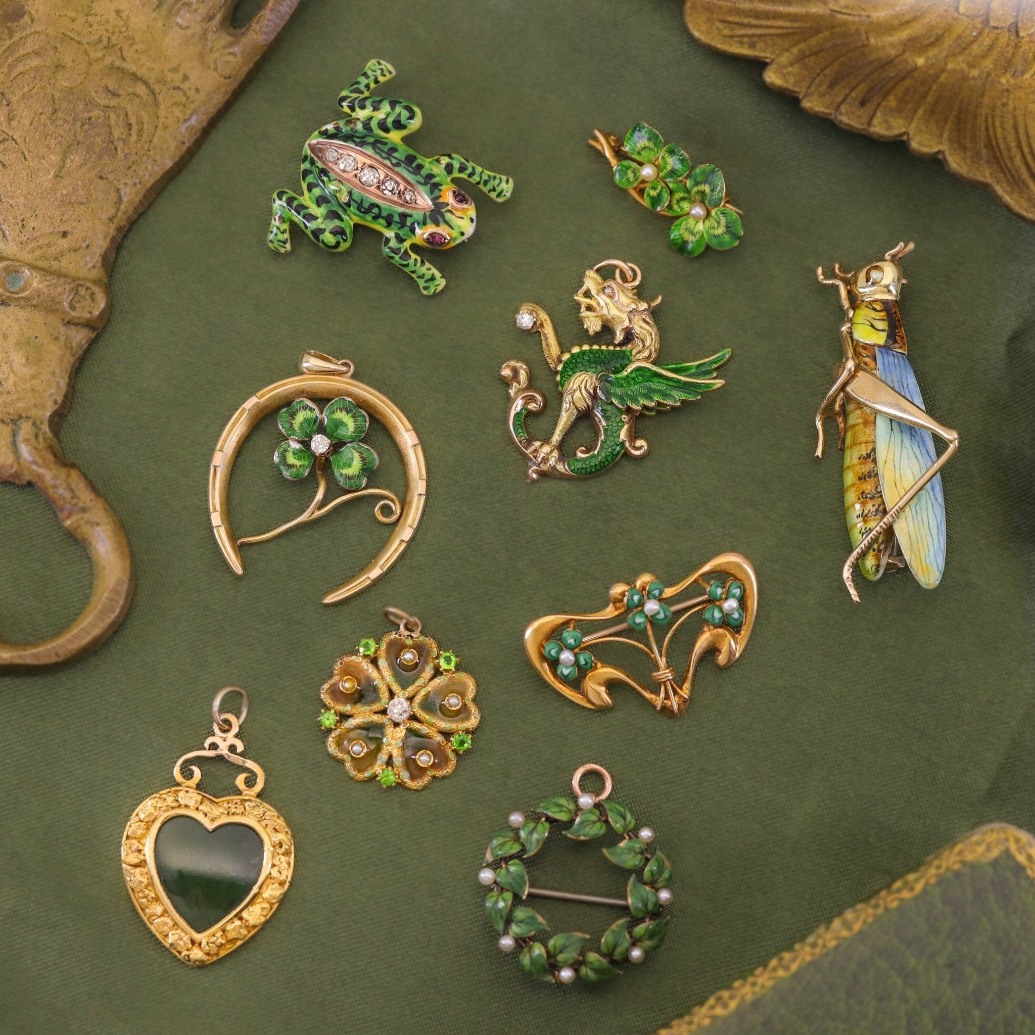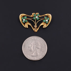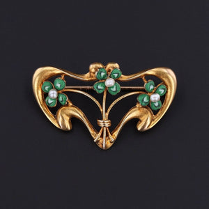 Charming and symbolic, this vintage lucky charm brooch (circa 1910–1920) features three clovers crafted in 10k gold, their leaves highlighted with green enamel and centered with luminous pearls. A classic emblem of luck, hope, and prosperity, the clover motif was a beloved design element in early 20th-century jewelry.