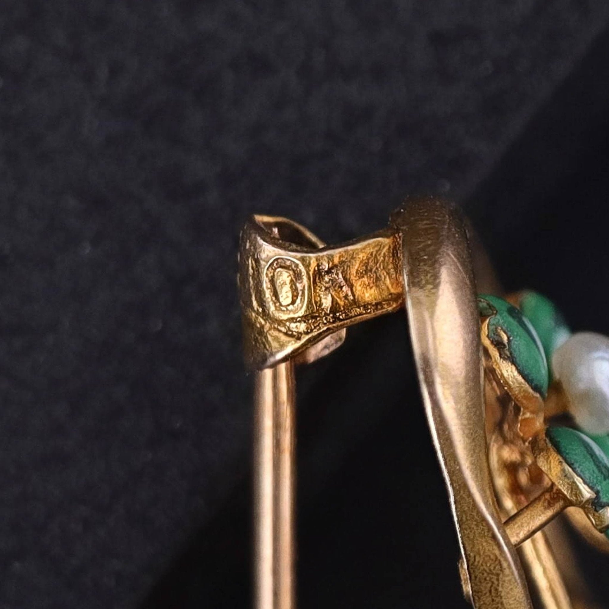 The brooch measures approximately 0.8 inches high by 1.2 inches wide and remains in excellent vintage condition, with enamel and pearls beautifully preserved.