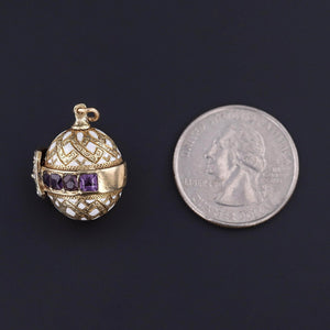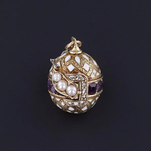 Regal and refined, this exquisite antique egg pendant (circa 1910) is crafted in solid 18k gold and adorned with vibrant enamel, shimmering pearls, amethysts, and a glinting rose cut diamond buckle motif. Echoing the luxurious style of Imperial Russian jewelry and Fabergé-inspired treasures, this richly detailed pendant is a rare and elegant charm steeped in early 20th-century sophistication.