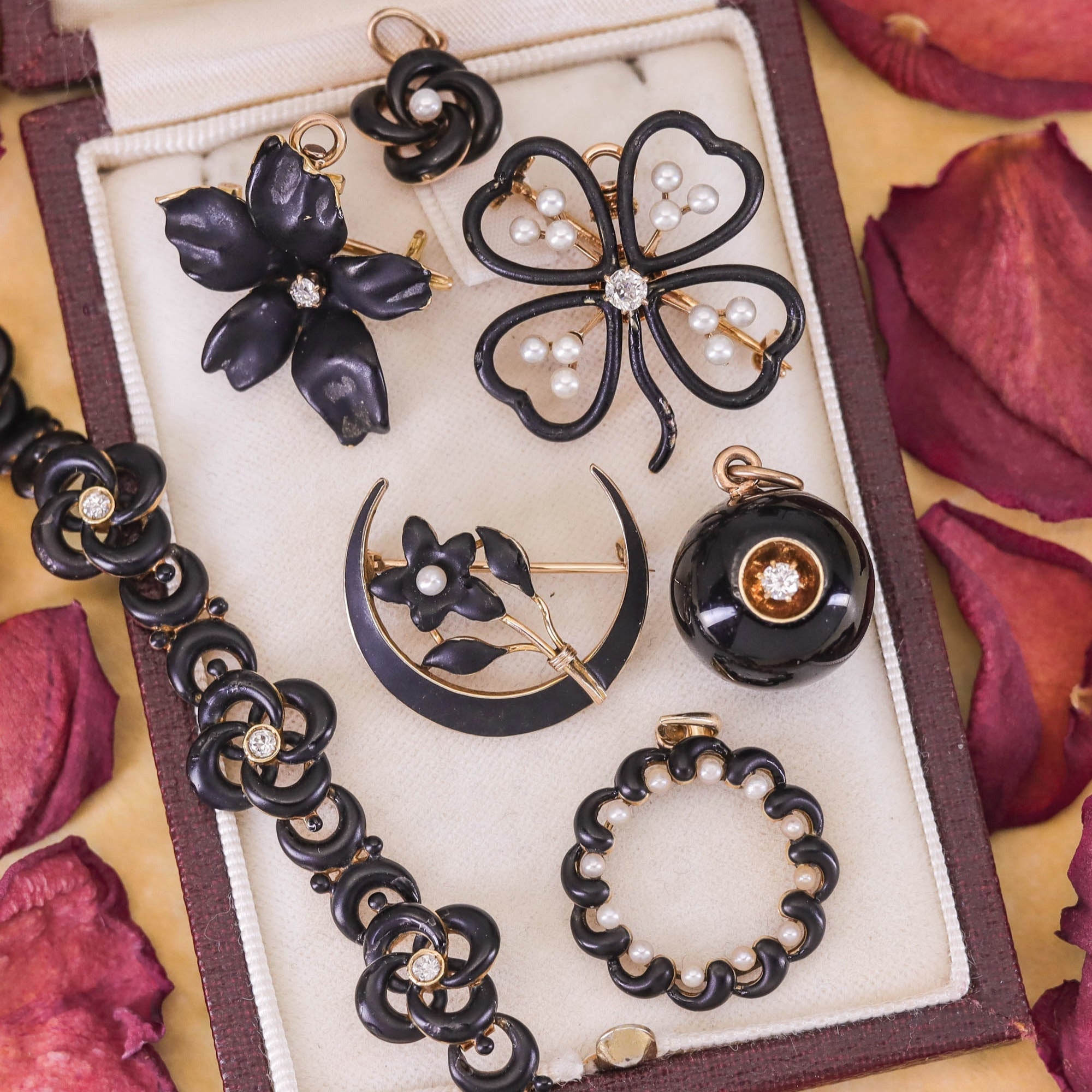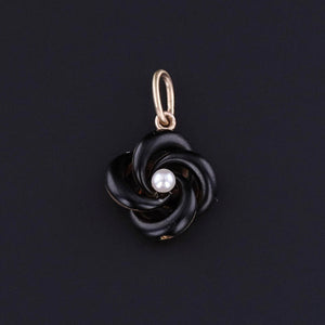 The design features an elegant love knot in 14k gold, richly accented with black enamel and finished with a single lustrous pearl at its center — a pairing that evokes both romance and refinement.