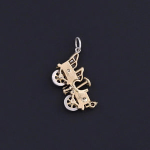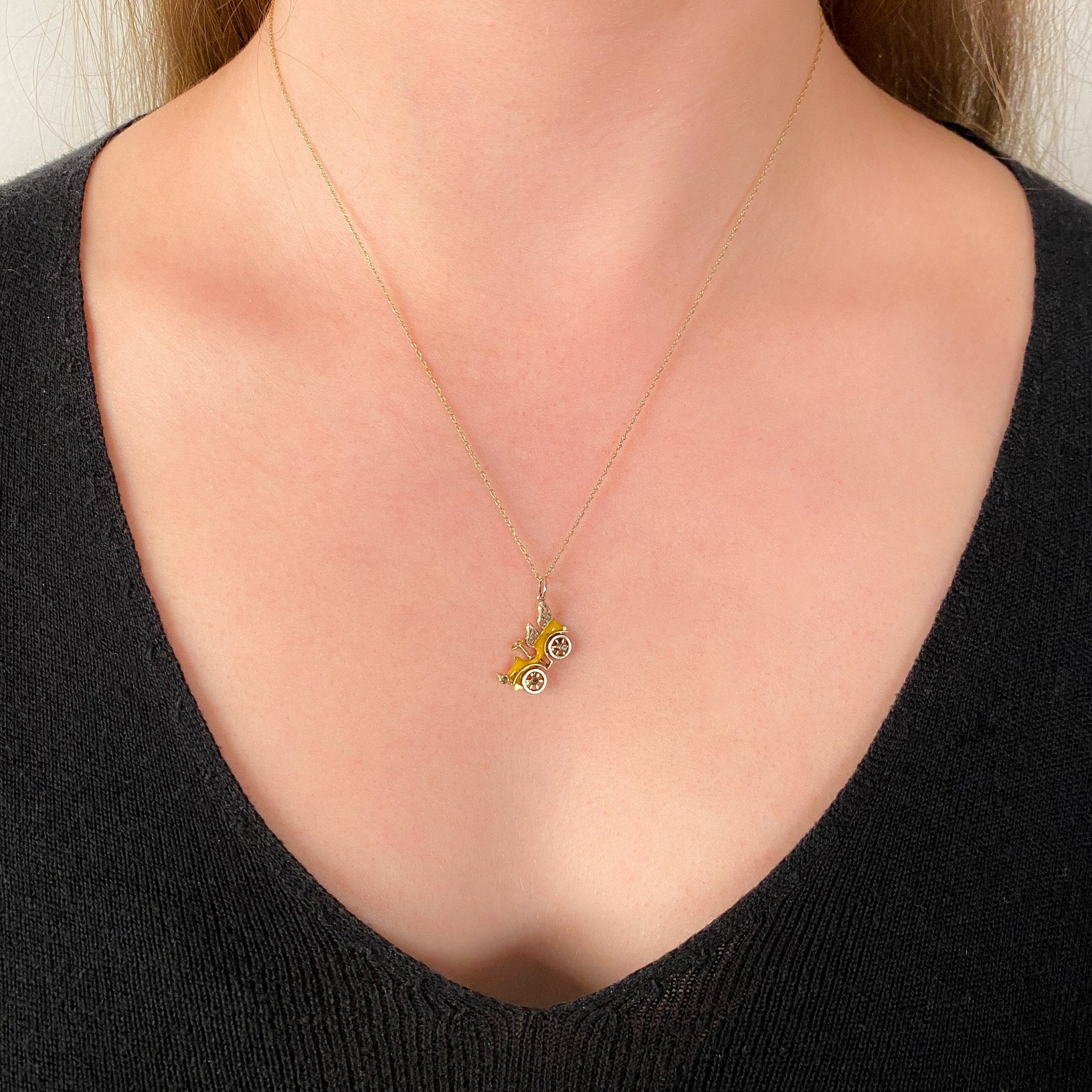 A whimsical yet luxurious jewel, this rare antique charm (circa 1920s) depicts a finely crafted car, likely modeled after the iconic Ford Model T. The body is rendered in 15ct gold, while the platinum wheels spin freely, a delightful detail that brings movement and charm to the piece.