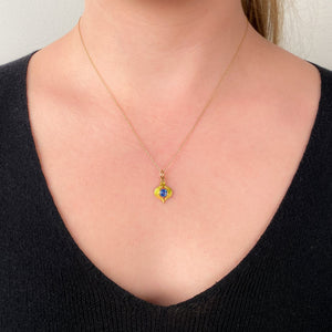 The piece remains in good condition overall, with only minor enamel loss that is visible under extremely close inspection. It has been tested using both XRF (X-ray fluorescence) technology and jeweler’s acid to verify the metal content, ensuring its authenticity as solid 10k gold with a 14k gold bail. A delightful antique charm with enduring appeal.