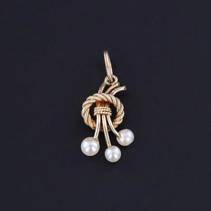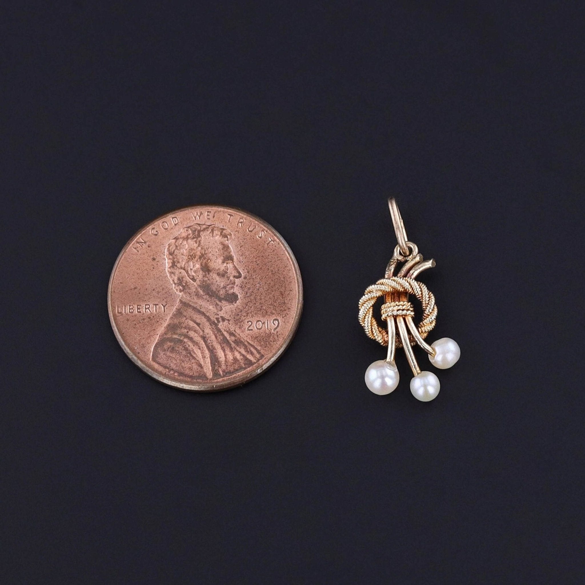 This elegant charm captures the grace of Edwardian-era jewelry (circa 1900) with three luminous pearls gracefully suspended from a finely crafted wreath of 14k gold. Once the adornment of an antique stickpin, it has been masterfully reimagined by our jeweler, who removed the original pin and welded on a 14k gold jump ring bail for modern wear.