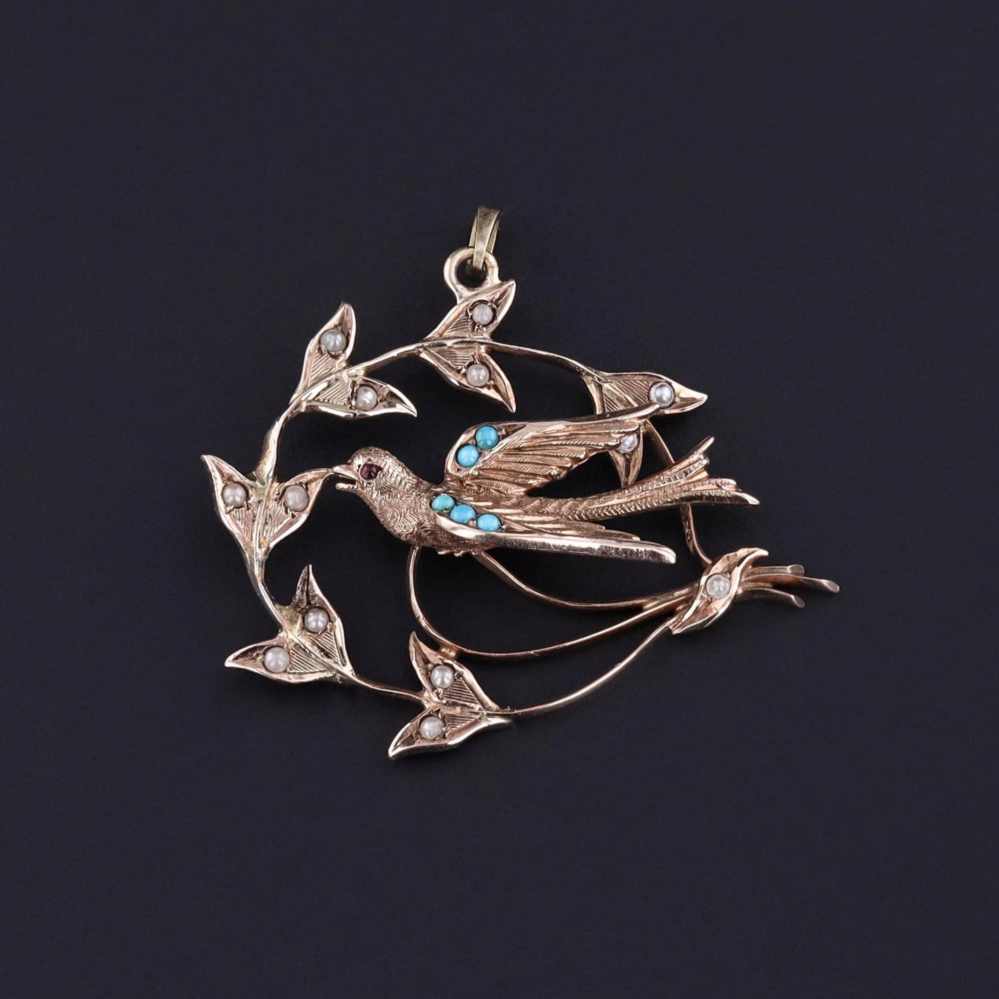 Charming and finely detailed, this antique bird pendant (circa 1900) was originally a brooch, later transformed by our jeweler with the addition of a custom 10k gold bail.