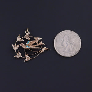The bird is crafted in 9ct gold and beautifully ornamented with simulated turquoise and simulated pearl accents, evoking the playful use of color and texture so beloved in turn-of-the-century jewelry design.