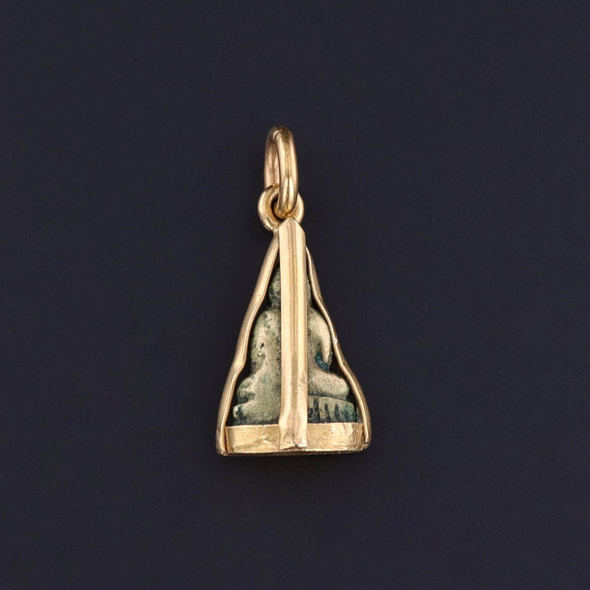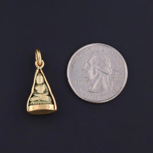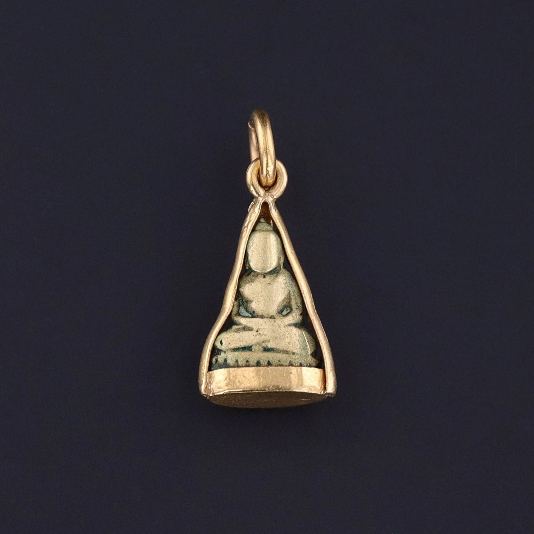 This vintage charm features a serene Buddha figure rendered in warmly worn brass with a natural green patina, seated in a meditative pose and securely mounted in a handcrafted 22k gold frame. The contrast between the high-karat gold and the time-softened surface of the Buddha creates a jewel that is both spiritually symbolic and visually compelling.