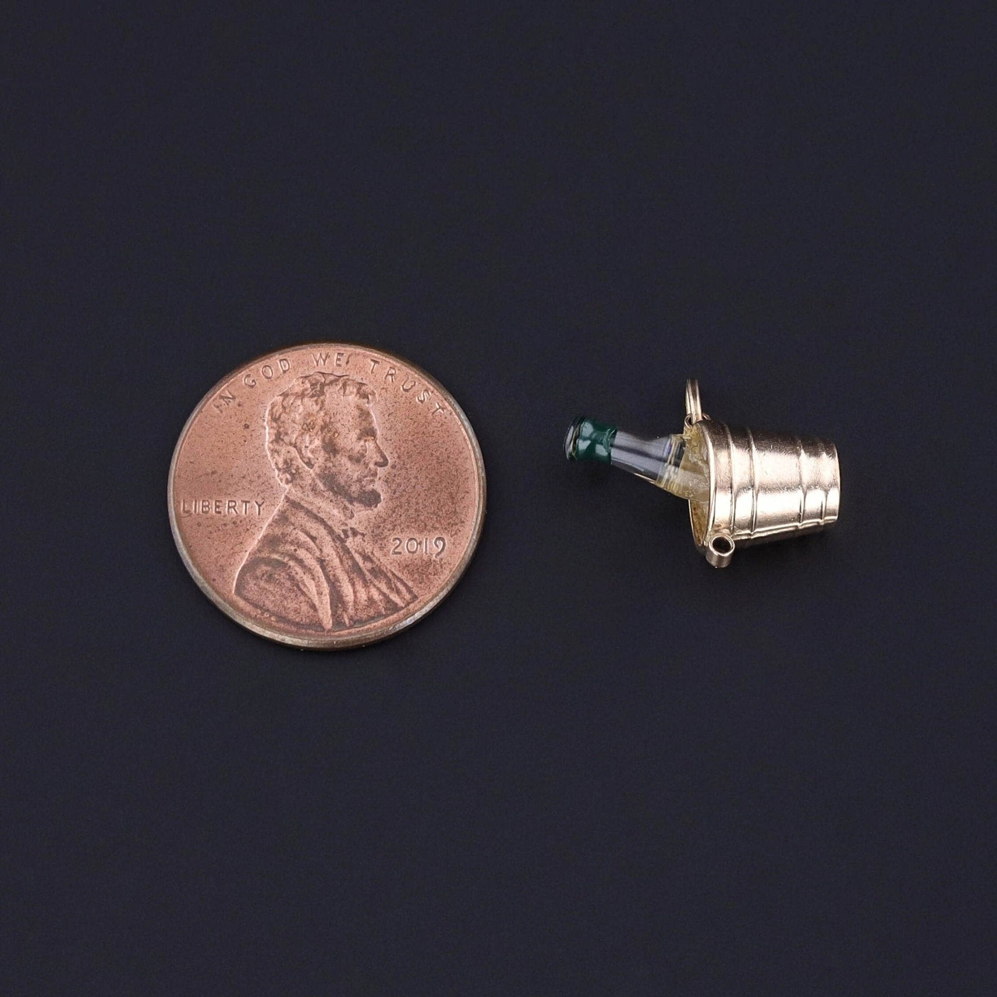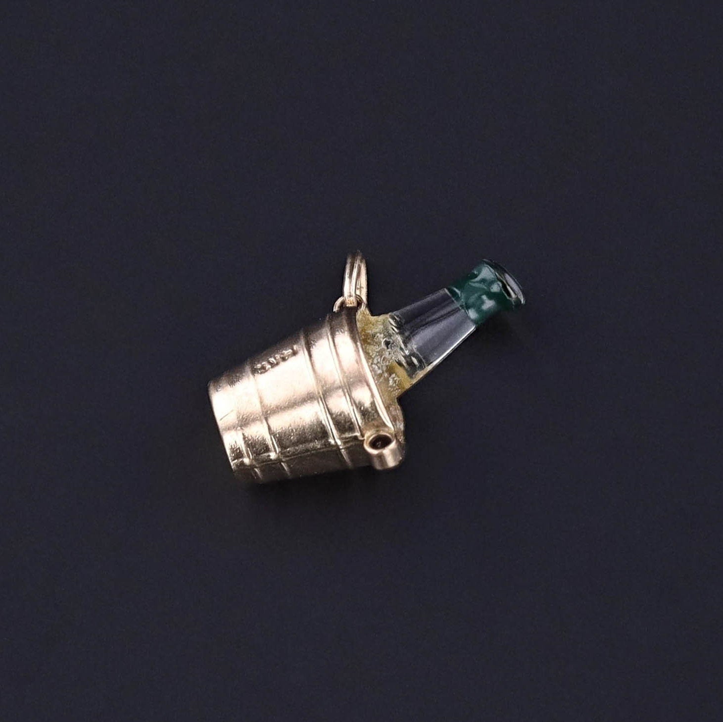 Playful and celebratory, this vintage charm (circa 1950–1960) is crafted in 14k gold and designed as a miniature champagne ice bucket, complete with a clear enamel bottle inside. A whimsical jewel, it captures the joy of life’s festive moments in finely detailed form.