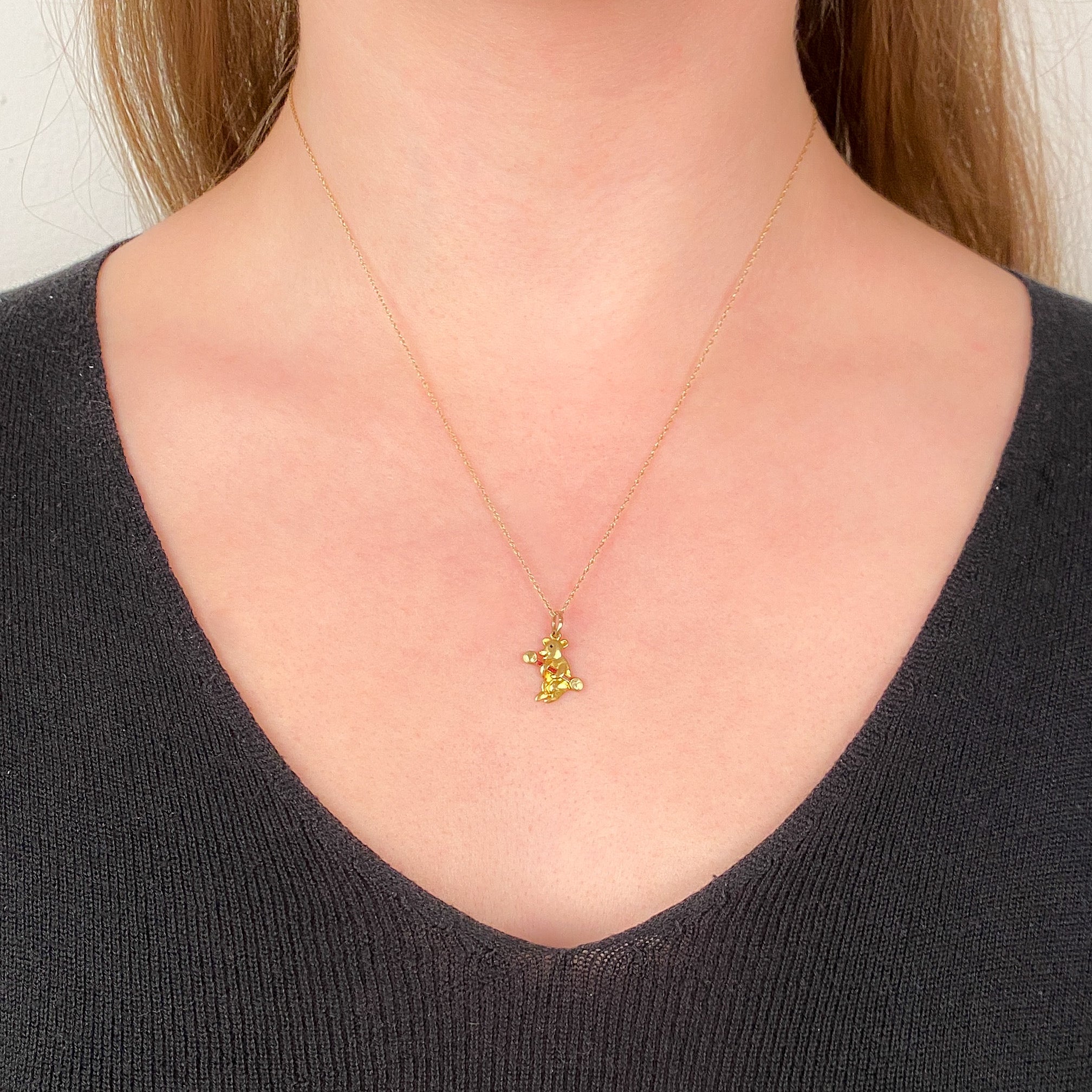 A delightful fusion of whimsy and refinement, this finely crafted bear charm is rendered in luminous 18k yellow gold, accented with rich red enamel that adds warmth and personality. Its petite yet substantial form captures early 20th-century charm, making it an ideal collector’s piece or thoughtful gift for a discerning jewelry lover.
