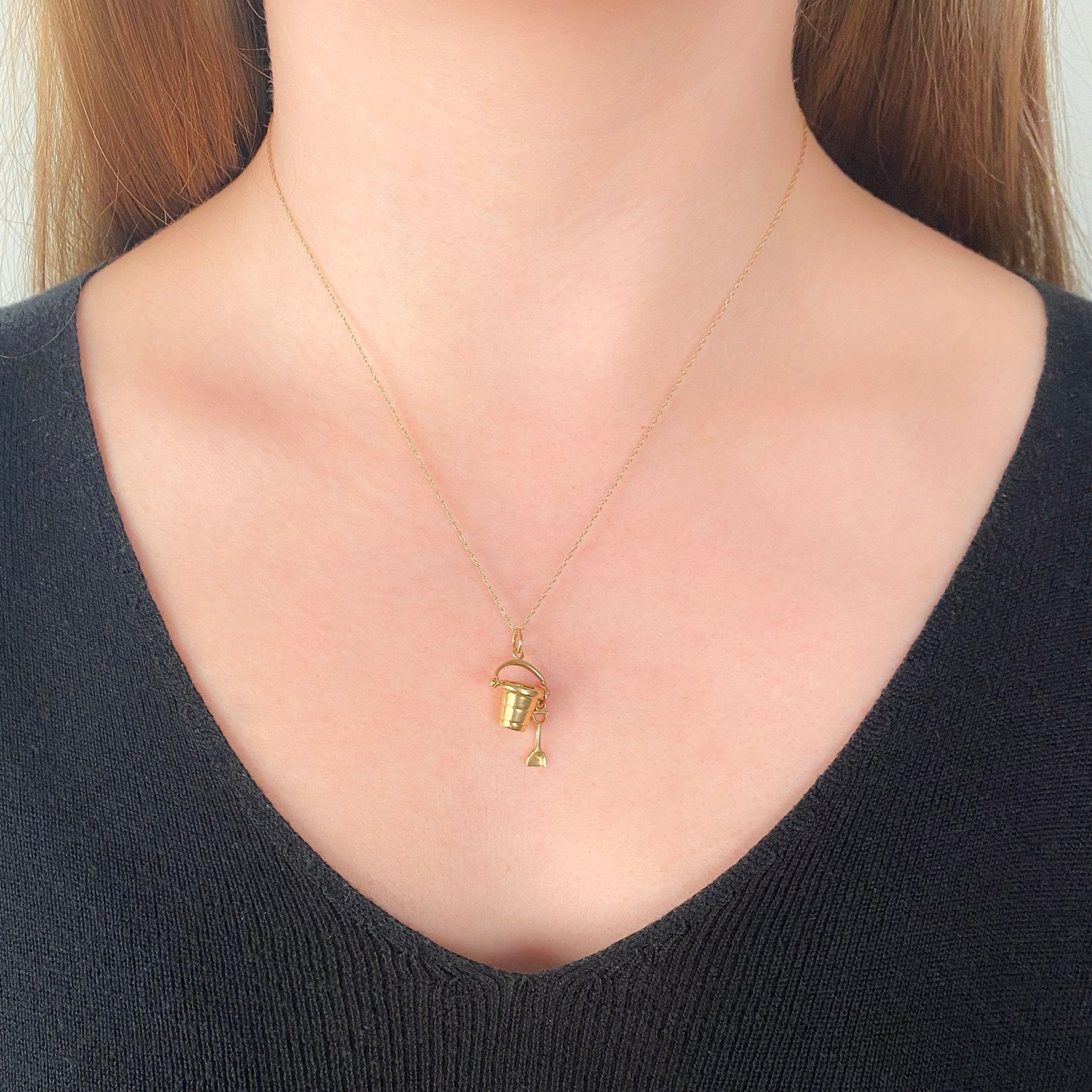 This whimsical vintage charm (circa 1950–1960) captures the carefree spirit of summer, depicting a finely crafted sand pail and shovel in solid 14k gold. Detailed and playful, it reflects the mid-century love of figural charms that celebrated leisure, travel, and joyful memories.