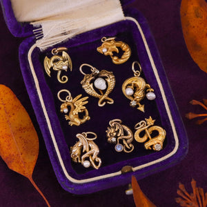 Bold and symbolic, this antique pendant (circa 1900–1910) began life as a stickpin and was later transformed with the addition of a 14k gold bail. The design features a finely detailed dragon in 14k gold, accented with a luminous post-set pearl that softens its fierce elegance.