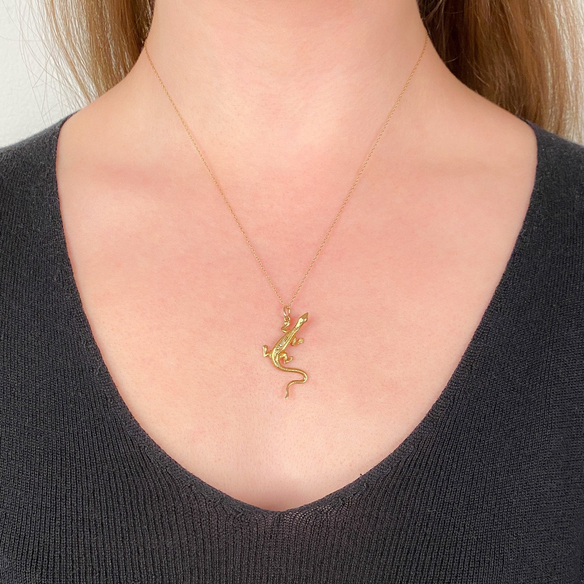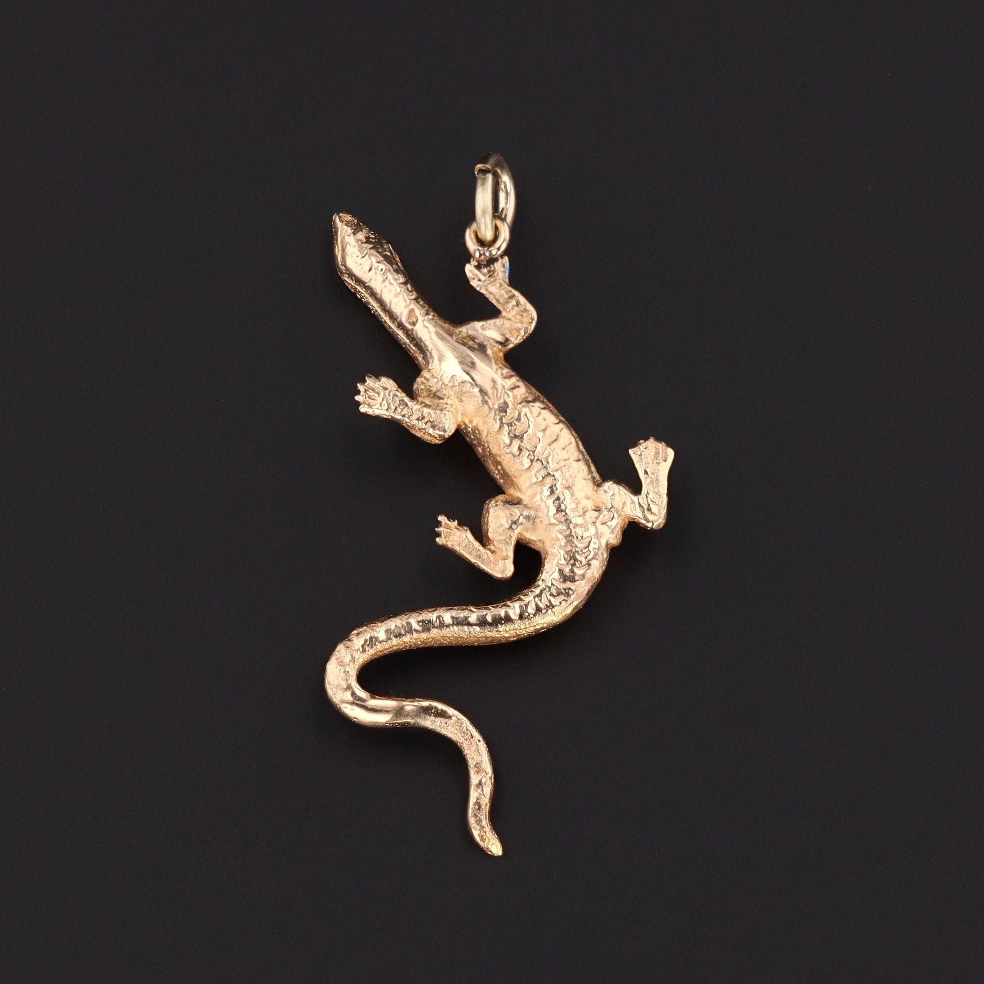 Playful yet undeniably luxurious, this whimsical lizard pendant captures the spirit of mid-century design (circa 1950). Crafted in warm 14k gold, the textured reptile glimmers with brilliant diamond accents and gazes out with vivid sapphire eyes.