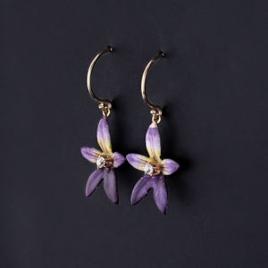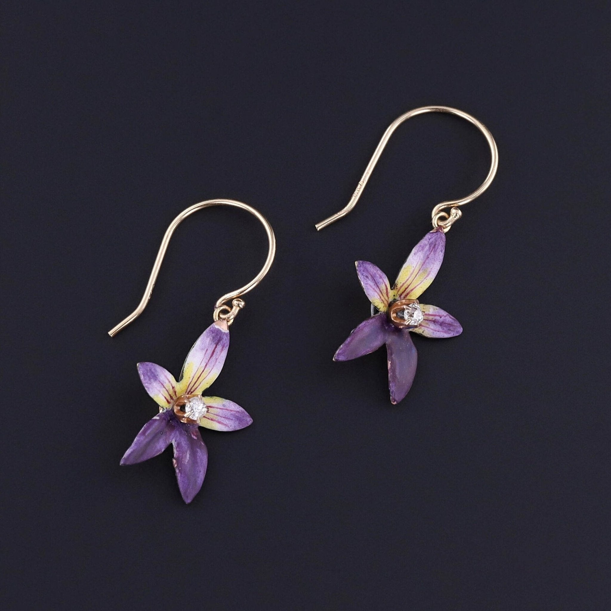 Graceful and feminine, these 14k gold earrings feature violet blossoms of rich purple enamel, each accented with a sparkling diamond at its center. The flowers were originally components of an antique brooch (circa 1910), thoughtfully reimagined by our jeweler into elegant dangle earrings with the addition of 14k gold ear wires.