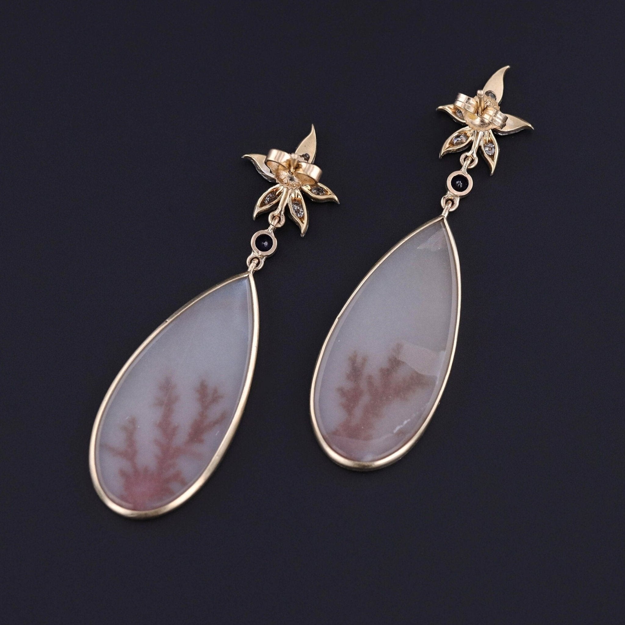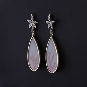 A striking blend of antique artistry and modern design, these one-of-a-kind earrings were created by transforming elements of a 1900's brooch into a fresh and wearable jewel. At their tops, old European cut diamond flowers — finely crafted in platinum-topped 14k gold — provide glittering brilliance, from which dangle luminous sapphire surmounts and dramatic dendritic agate drops.