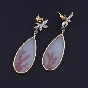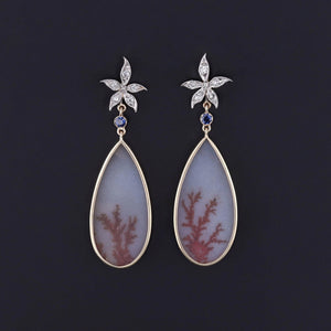 The dendritic agates, with their unique natural inclusions resembling delicate branches or landscapes, make each earring truly distinctive. The combination of antique diamonds, richly hued sapphires, and the painterly beauty of dendritic agate creates a jewel that balances history with contemporary elegance.