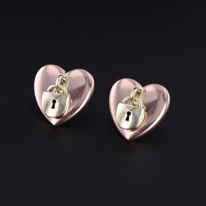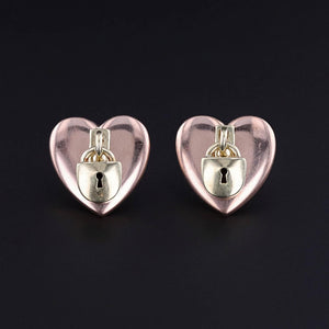 Romantic and symbolic, these vintage earrings (circa 1940–1960) feature hearts of warm 14k rose gold, each accented with a 14k yellow gold padlock. The design captures the timeless symbolism of love and devotion, rendered in a chic two-tone gold combination.
