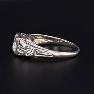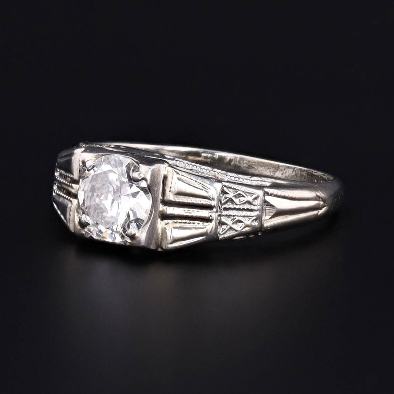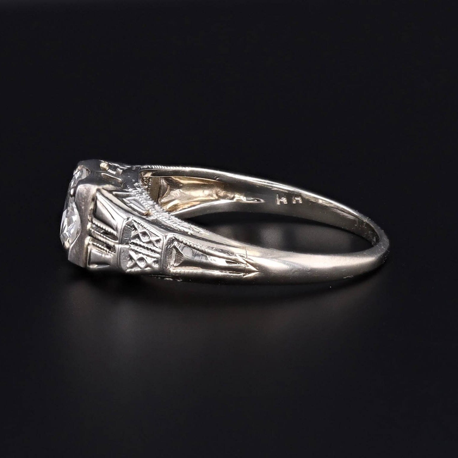 A striking blend of geometry and grace, this authentic Art Deco engagement ring (circa 1920s–1930s) showcases a beautifully proportioned 0.63 carat old European cut diamond nestled within a finely detailed openwork mounting. The linear, architectural design—crafted in richly toned 14K white gold—epitomizes the bold sophistication of the Jazz Age.