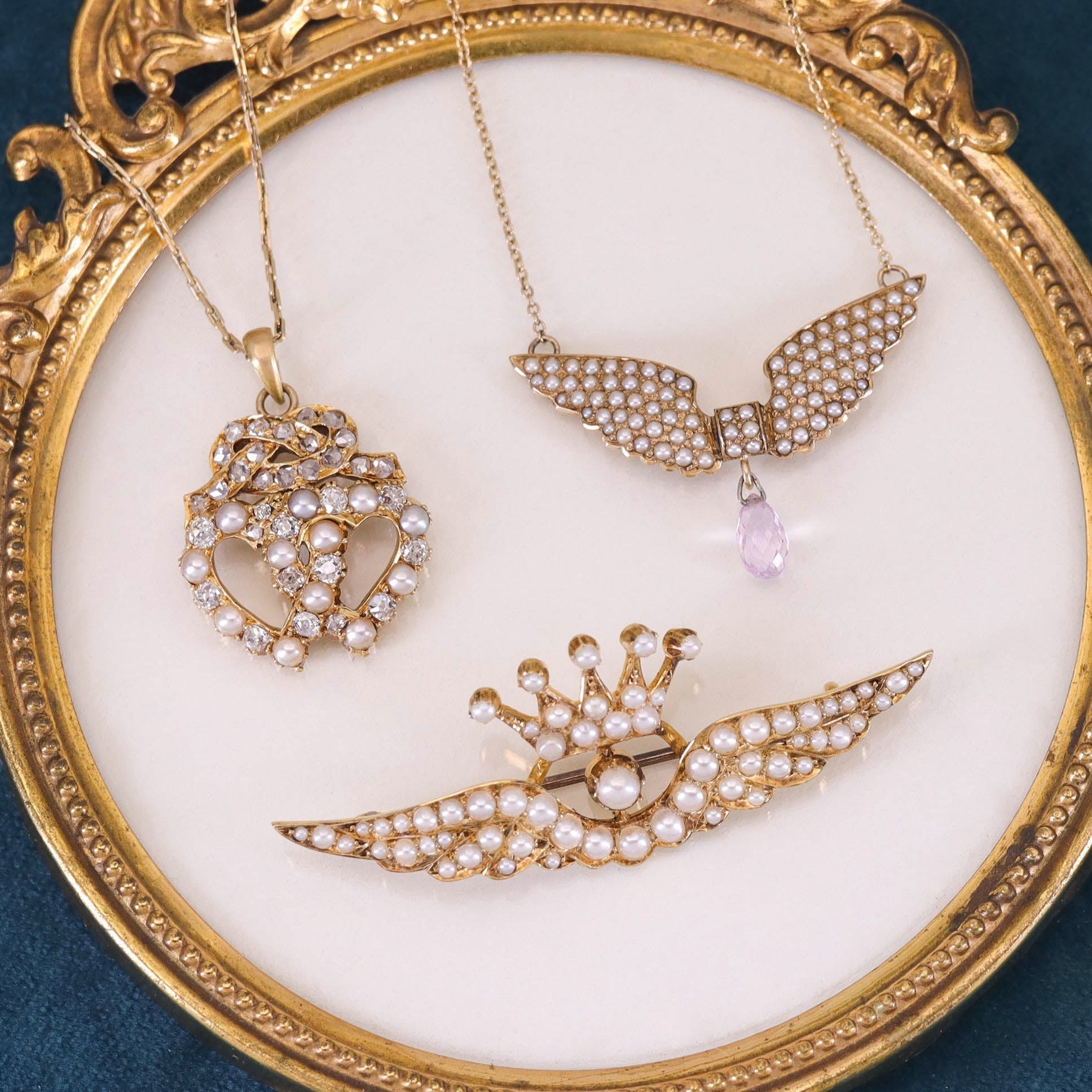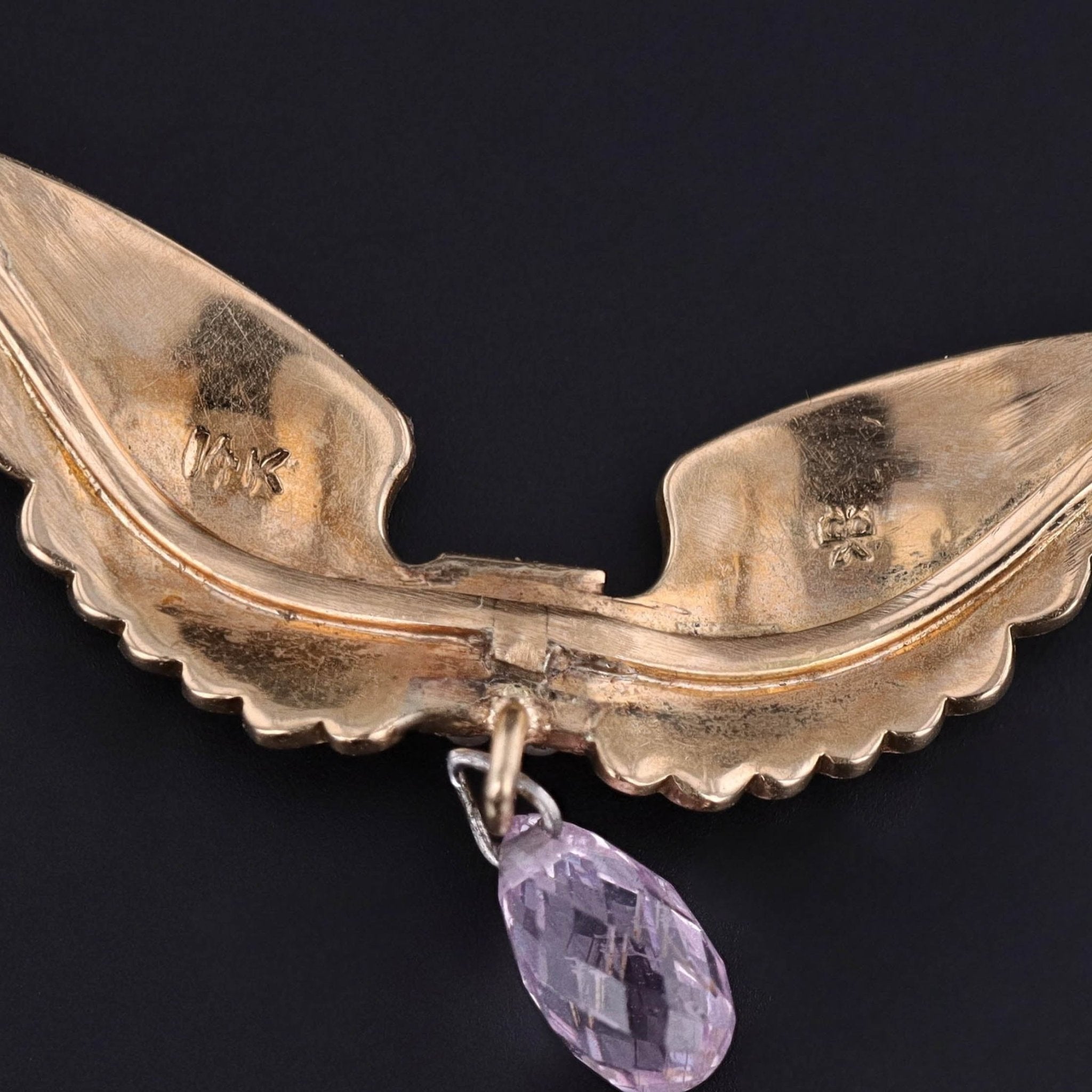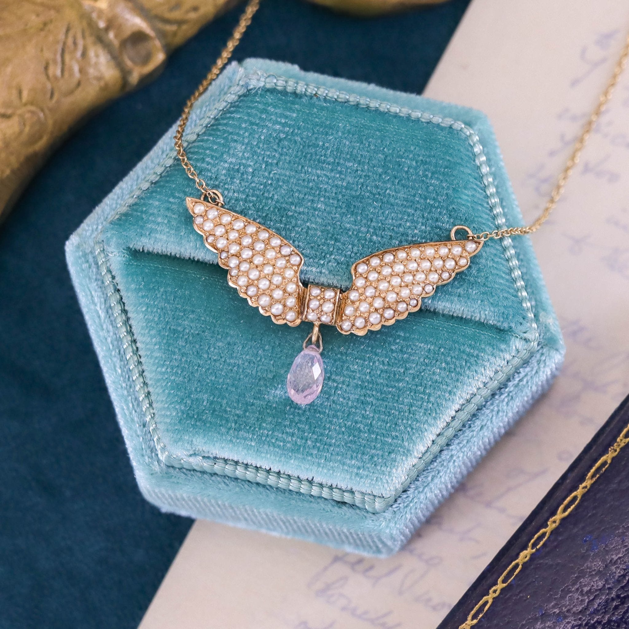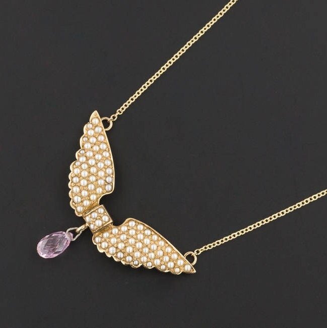 Delicate yet striking, this elegant necklace features a winged motif adorned with luminous half pearls and a sparkling pink sapphire briolette drop. The winged centerpiece—originally an antique 14k gold watch pin dating to circa 1900–1910—has been artfully reimagined by our jeweler into a romantic necklace. The original pin findings were removed, a 14k gold chain was seamlessly welded on, and a faceted pink sapphire dangle was added to complete the transformation.