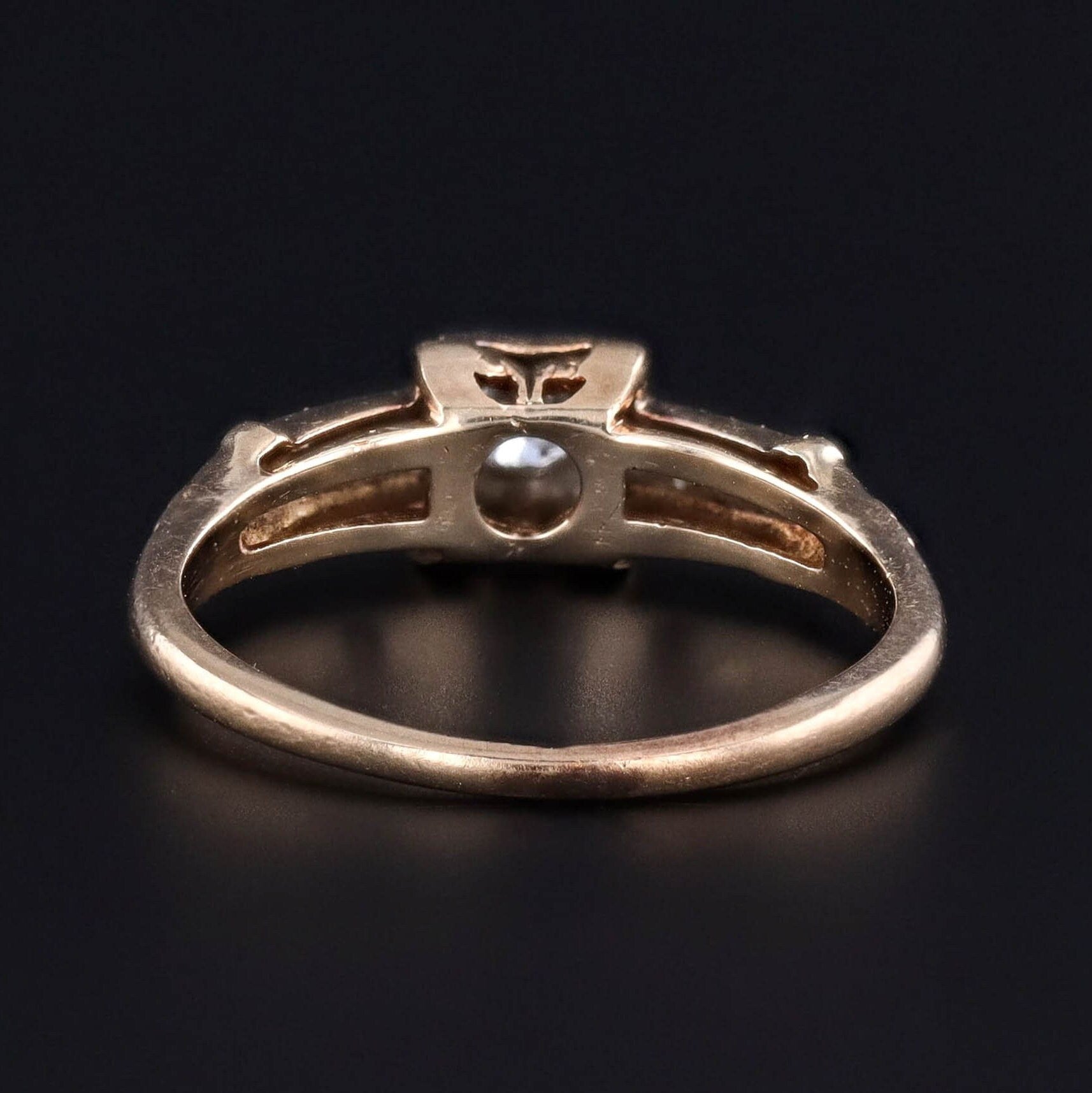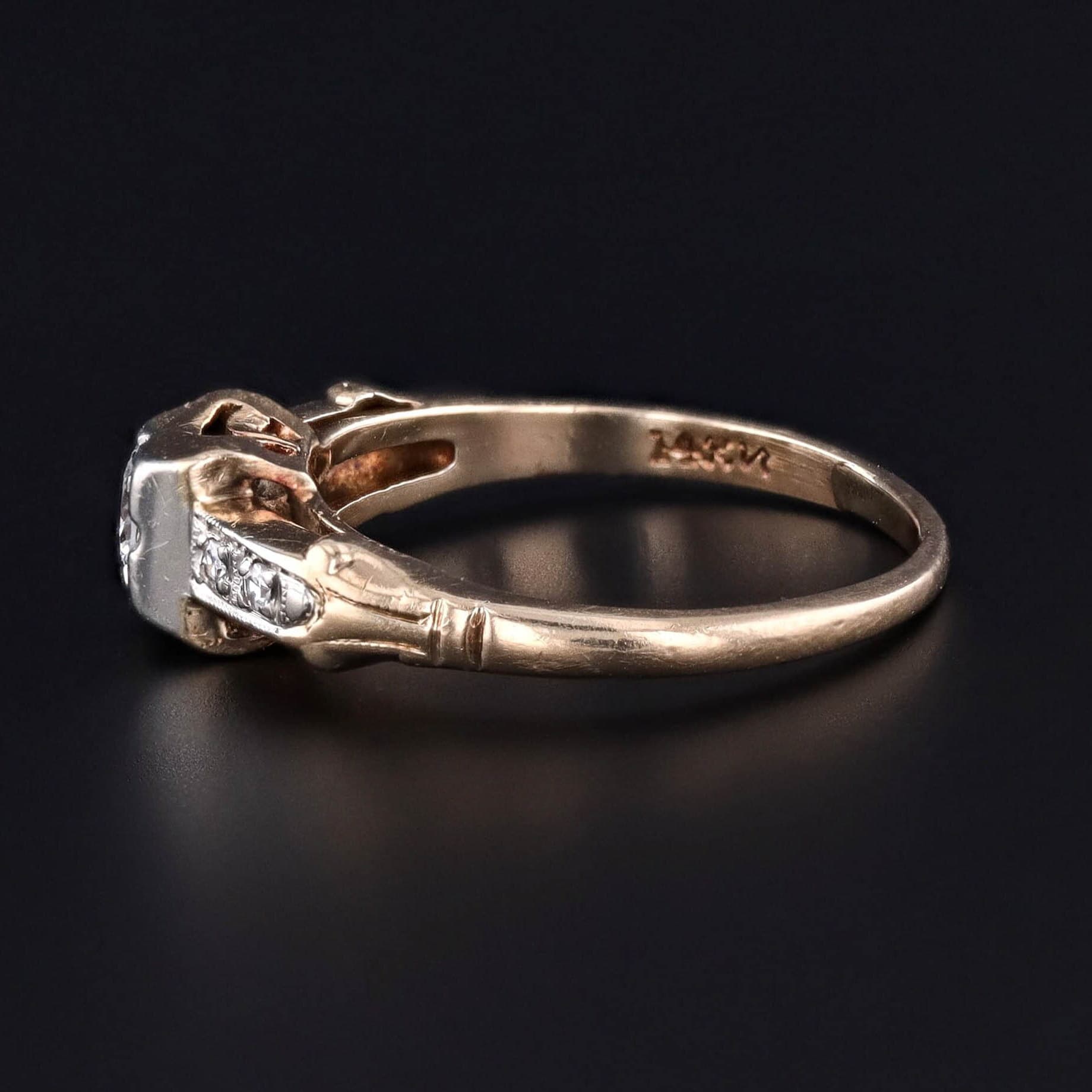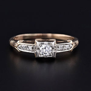 This vintage engagement ring (circa 1950–1960) features a modern round brilliant-cut diamond of approximately 0.132 carats (G color, VS2 clarity) accented by four single-cut diamonds (G color, VS–SI clarity) totaling about 0.136 carats. Together, the diamonds create a delicate shimmer that reflects the refined elegance of mid-20th-century design.