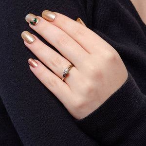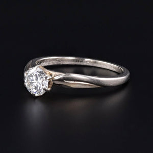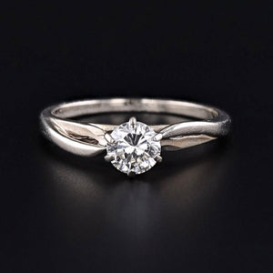 Timeless elegance meets modernist design in this vintage engagement ring (circa 1980-1990), showcasing a dazzling 0.568ct modern round brilliant diamond set within a sculptural, asymmetrical 14k white gold mounting. The unique silhouette offers a contemporary twist on a classic form, making it a sophisticated choice for those who appreciate refined, understated luxury.