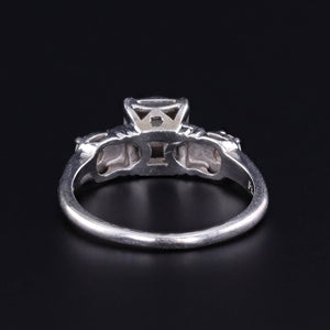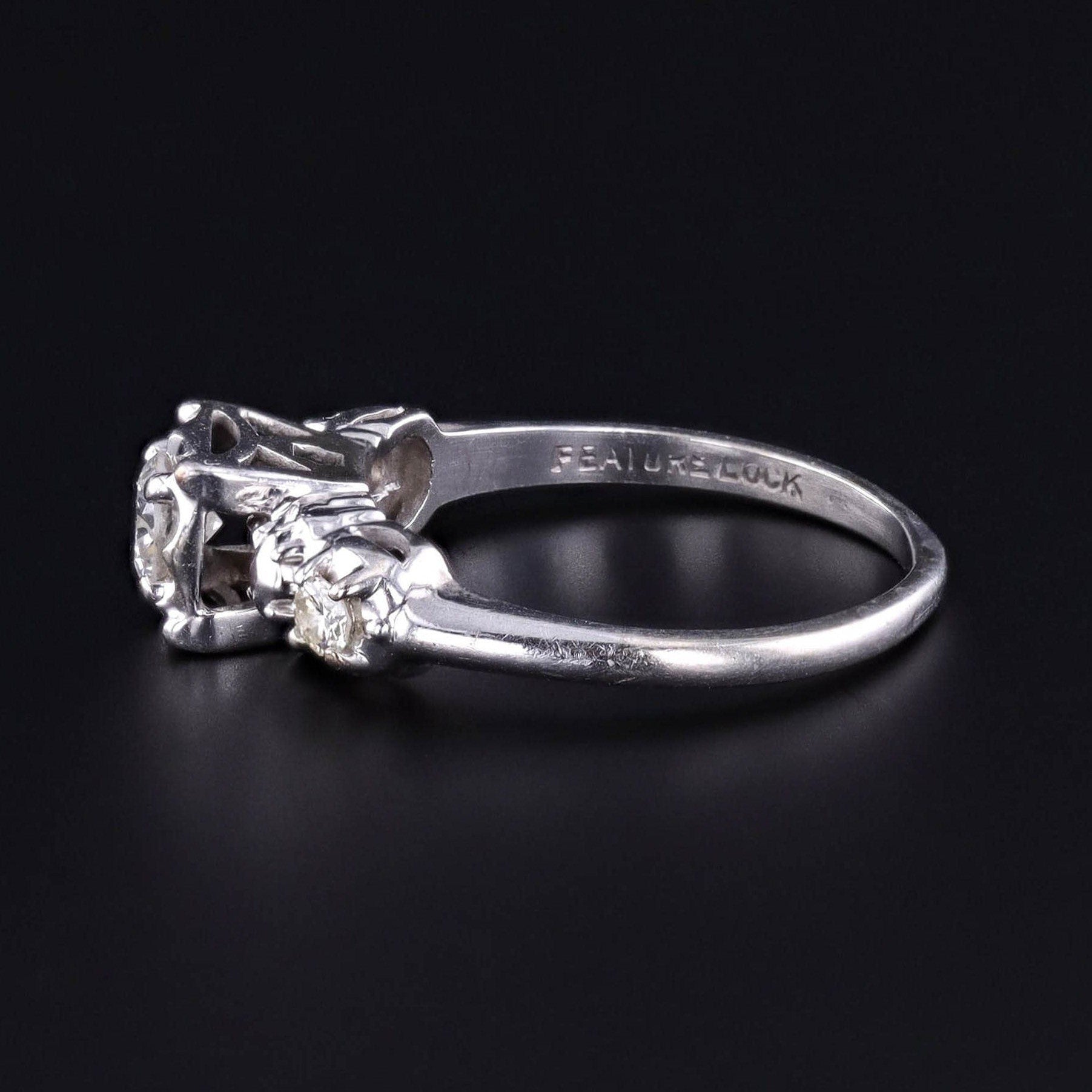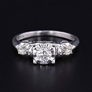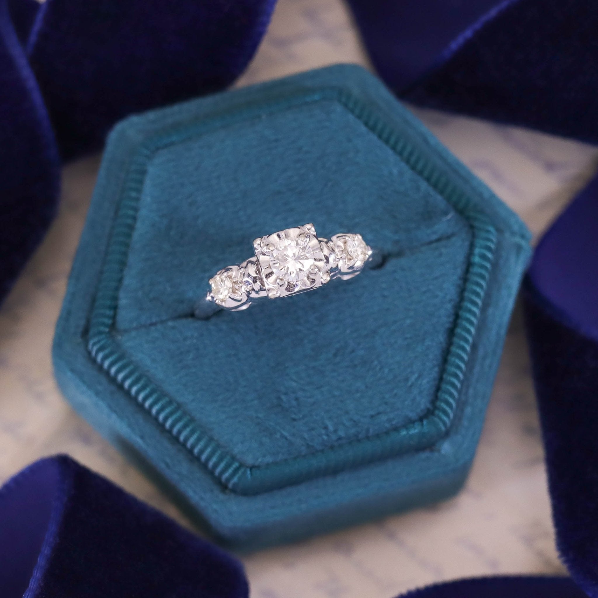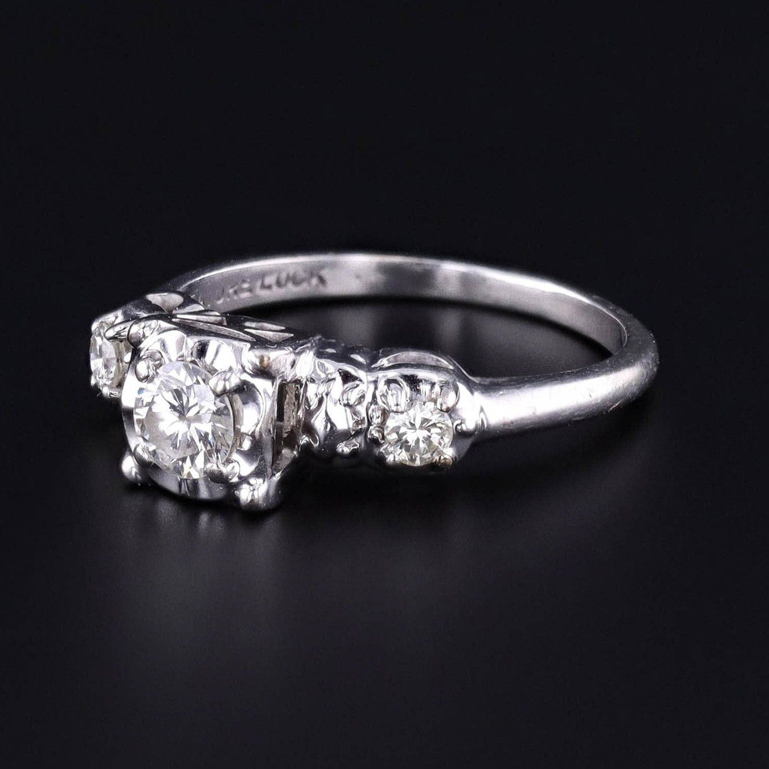 Classic and enduring, this vintage engagement ring (circa 1970–1980) is crafted in 14k white gold and set with three modern round brilliant-cut diamonds — a timeless design symbolizing the past, present, and future of a relationship.