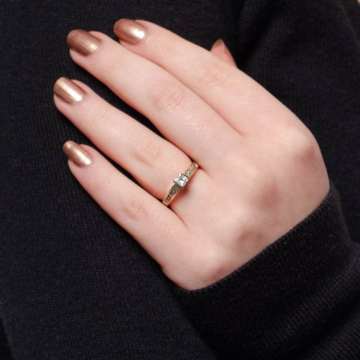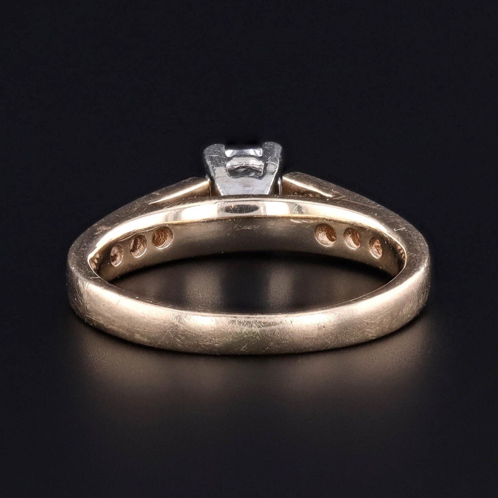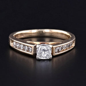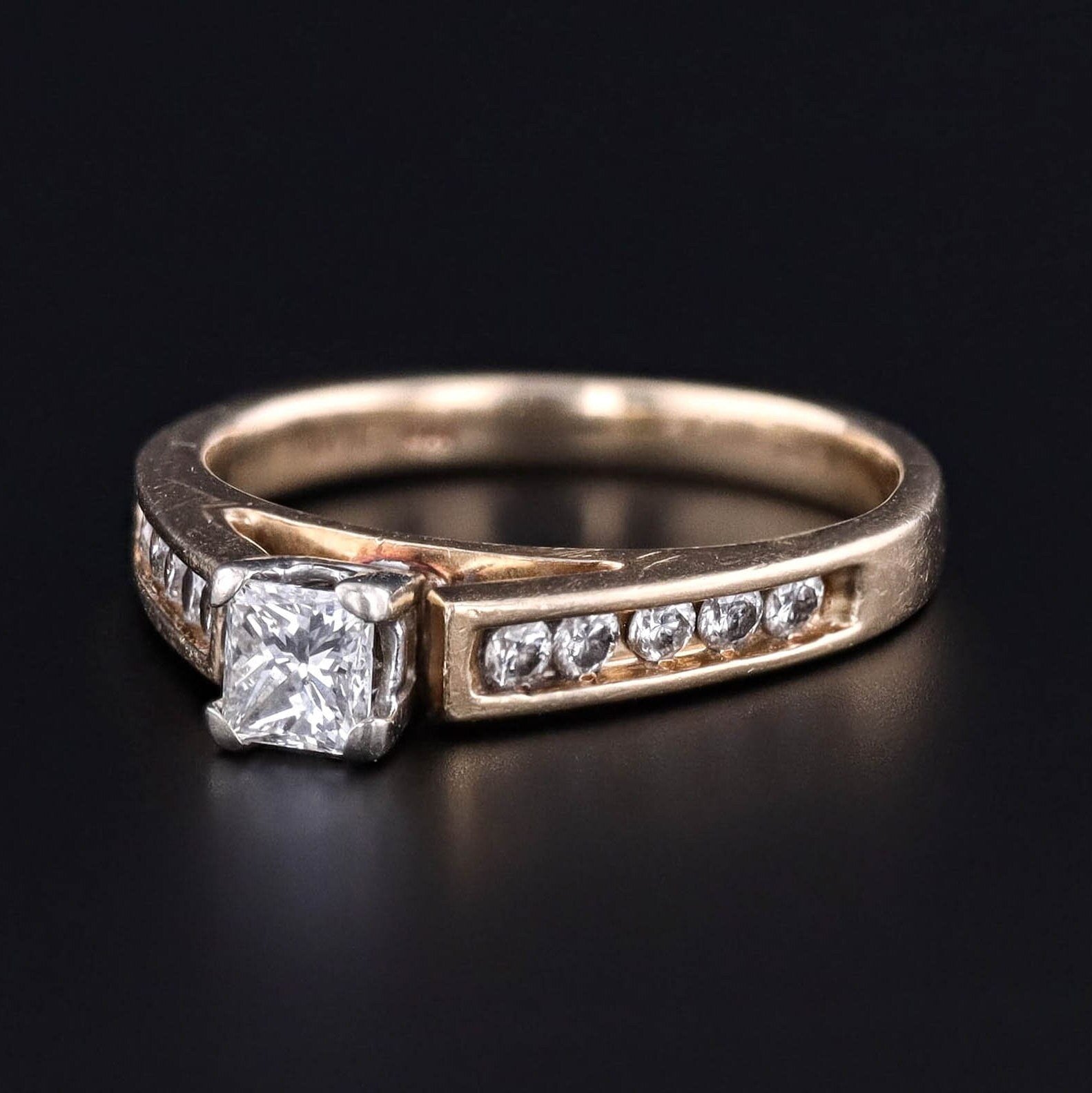 This vintage engagement ring (circa 1980–1990) features a sparkling princess-cut diamond of approximately 0.30 carats (H–I color, SI2 clarity) set in warm 14k gold. The bold, modern geometry of the princess cut is softened by the brilliance of 10 round channel-set diamonds along the band, bringing the total diamond weight to approximately 0.50 carats.