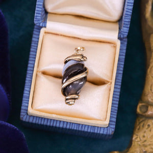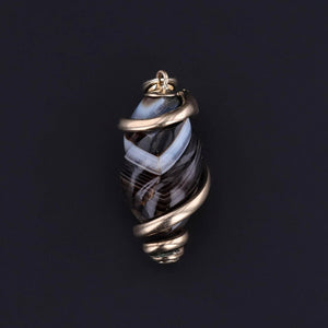 A striking emblem of eternal love, wisdom, and transformation, this antique pendant features a finely sculpted 9ct gold serpent coiled gracefully around a polished banded agate. The natural agate—rich with earthy striations—serves as a grounding backdrop to the sinuous, golden form of the snake, a powerful motif revered in Victorian jewelry for its deep symbolic meaning.