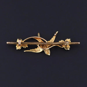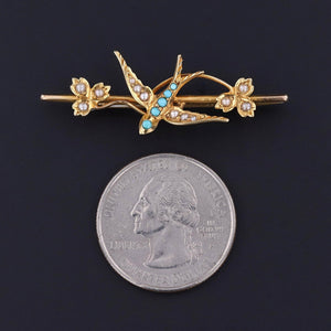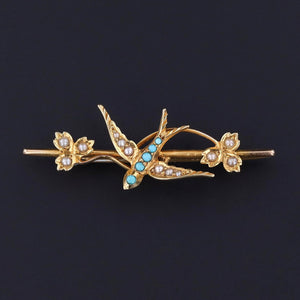 A graceful design from the early 20th century (1910-1920), this antique 15ct gold bar pin features a delicately rendered bird perched on a branch, ornamented with turquoise cabochons and tiny half pearls. The charming composition embodies the Edwardian era’s love of naturalistic motifs, where birds often symbolized joy, hope, and freedom.