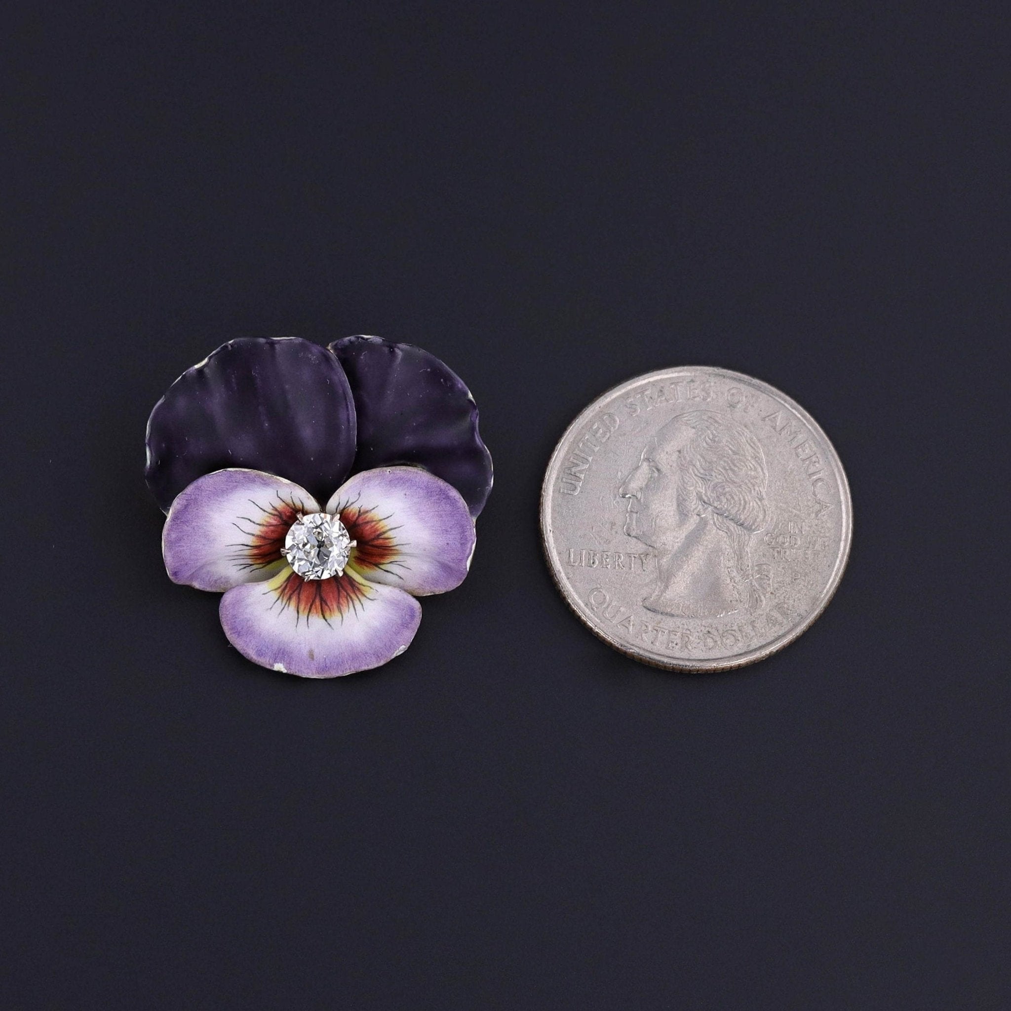 Delicate, sentimental, and exquisitely crafted, this antique pansy brooch (circa 1890–1900) captures the refined charm of late Victorian jewelry. The vibrant purple enamel petals—shaded with lifelike depth—form a striking pansy, a flower historically associated with remembrance and thoughtfulness.