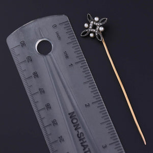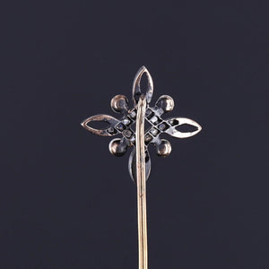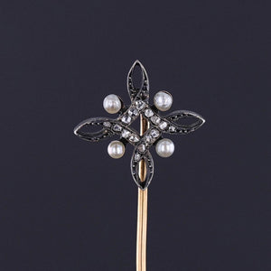 This antique stickpin (circa 1870) is crafted in silver-topped 18k gold and accented with glistening rose cut diamonds and four luminous pearls. The combination of soft luster and antique sparkle reflects the refined elegance of mid-19th-century design, when stickpins were essential accessories for both men and women of fashion.