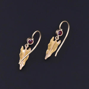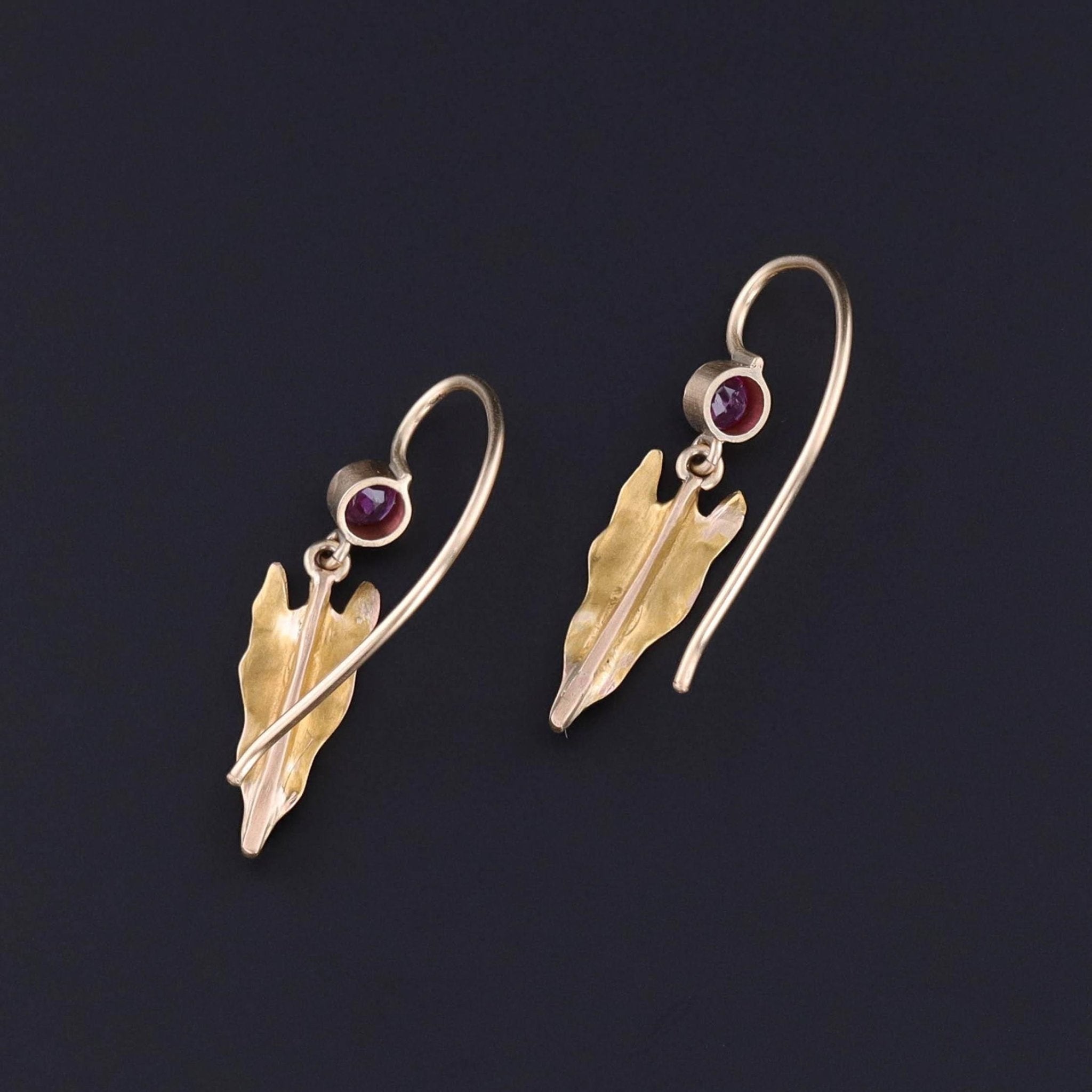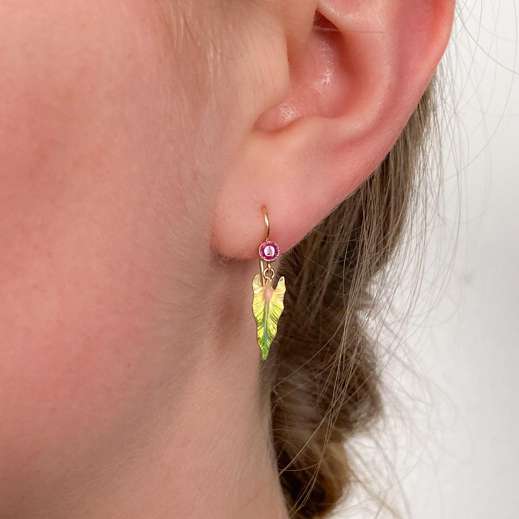 These elegant earrings feature finely detailed leaves of 14k gold, richly adorned with lustrous enamel. Originally part of an antique pin (circa 1910), they have been thoughtfully transformed by our jeweler into earrings with the addition of 14k gold ear wires and vibrant ruby surmounts. The combination of enamel artistry, glowing gold, and gemstone sparkle makes them both refined and distinctive.
