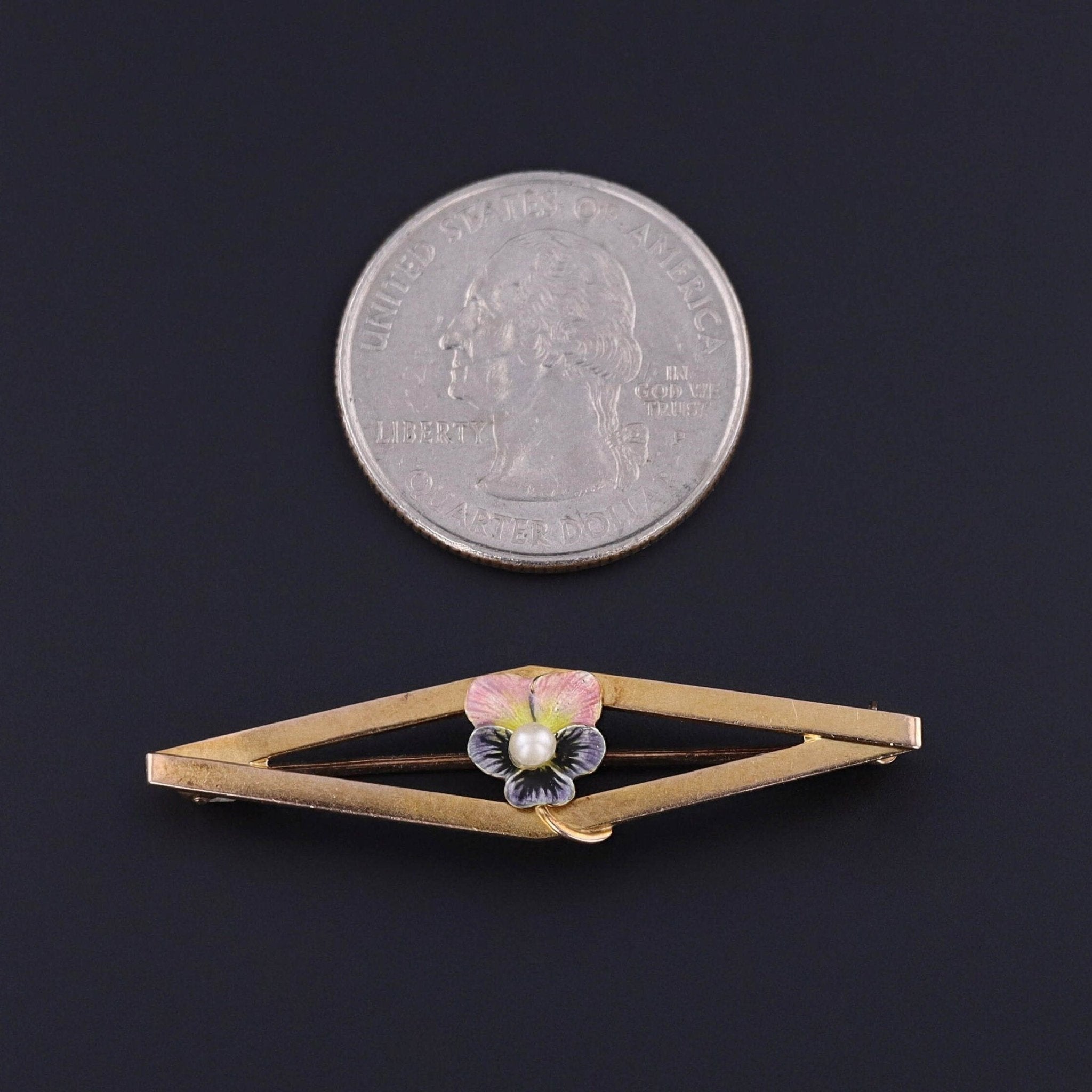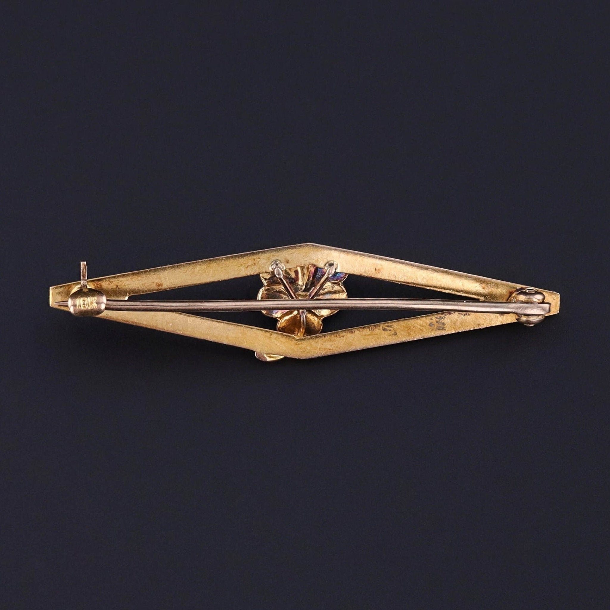 The pin measures 0.45 inches by 1.75 inches wide. It remains in great condition, with only the most minor wear along the periphery of the top right petal (visible under magnification and consistent with age).