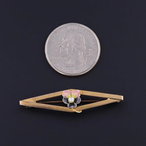 A delicate jewel of Edwardian artistry (circa 1910), this antique 10k gold pin showcases a finely enameled pansy rendered in shades of soft pink and purple. At the flower’s heart rests a lustrous natural pearl, adding a touch of refined luminosity.