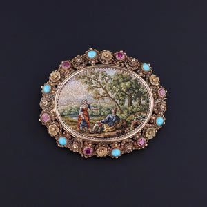 A true masterpiece of early 19th-century craftsmanship, this exceptional micromosaic brooch (circa 1800–1825) evokes the beauty and narrative depth of a fine Renaissance painting, rendered in thousands of hand-cut tesserae by a highly skilled artisan. The scene—rich in atmosphere—features delicately shaded foliage, finely rendered human figures, and a charming village nestled in the distance, demonstrating the extraordinary attention to perspective, realism, and artistic subtlety.