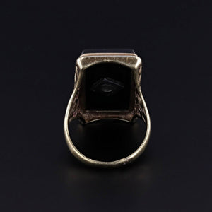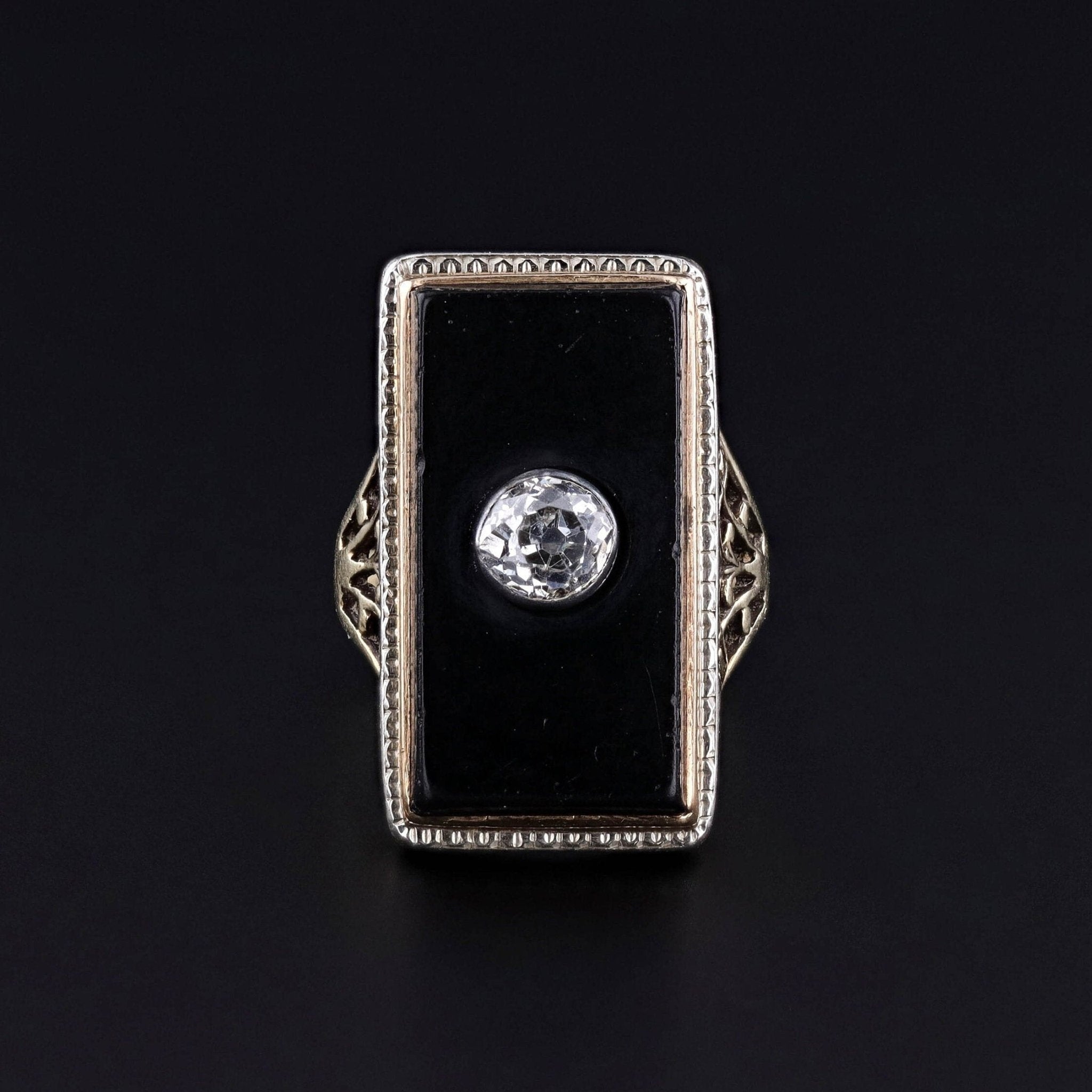 A breathtaking example of Edwardian elegance, this antique ring (circa 1910–1915) features a mesmerizing old European cut diamond, nestled in a dramatic black onyx surround and framed by an intricate 14K yellow gold filigree mounting. The interplay of light and shadow from the high-dome diamond against the sleek, opaque onyx makes this ring a captivating study in contrast and sophistication.
