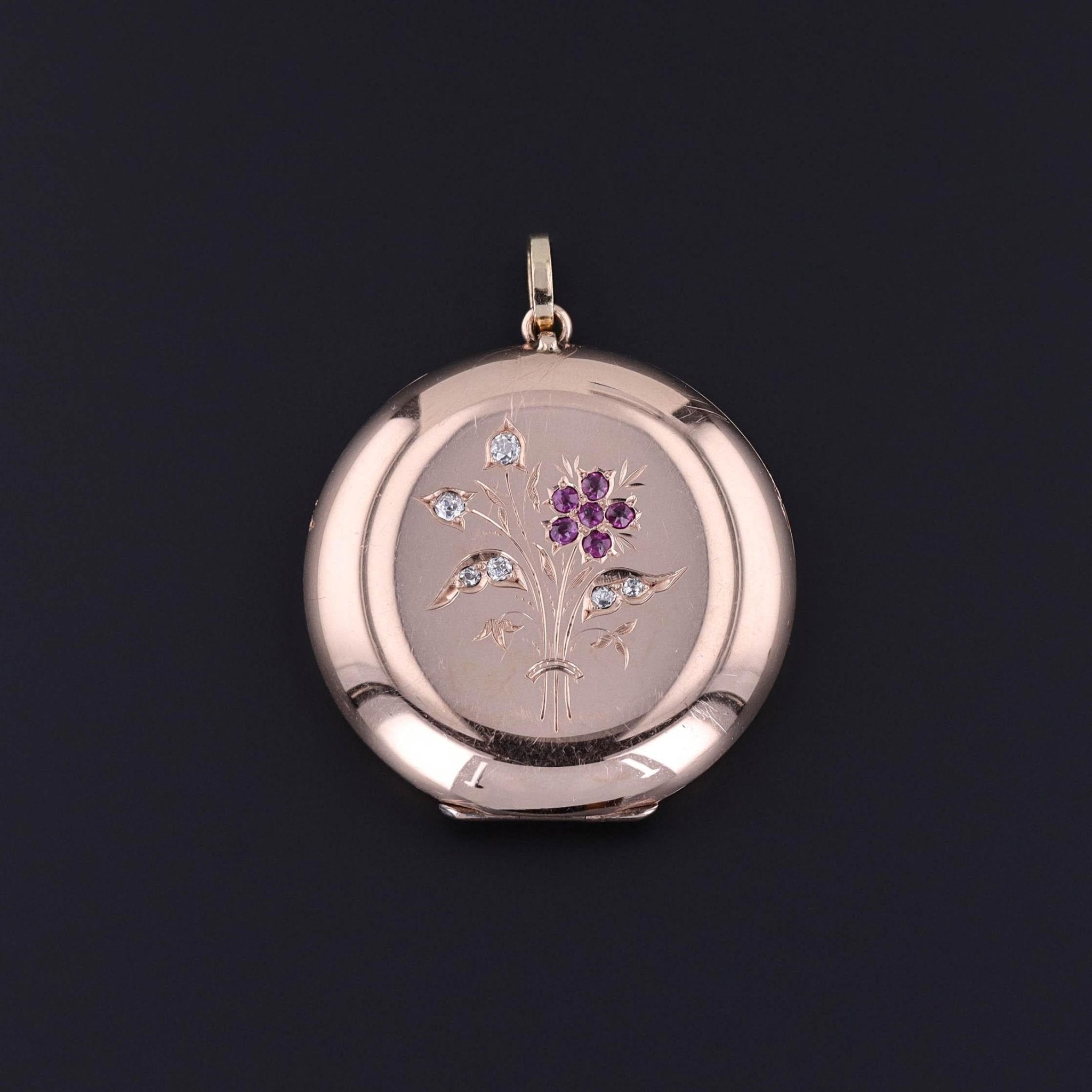 A jewel of romantic sentiment and refined craftsmanship, this antique locket (circa 1900–1915) is handcrafted in warm 14k rose gold and adorned on the front with a delicate ruby flower accented by six sparkling diamonds. The combination of rich ruby, luminous diamonds, and softly glowing rose gold captures the elegance and femininity of early 20th-century design.