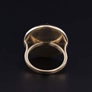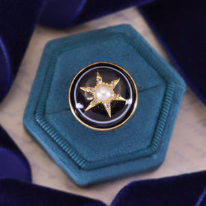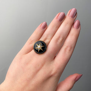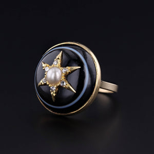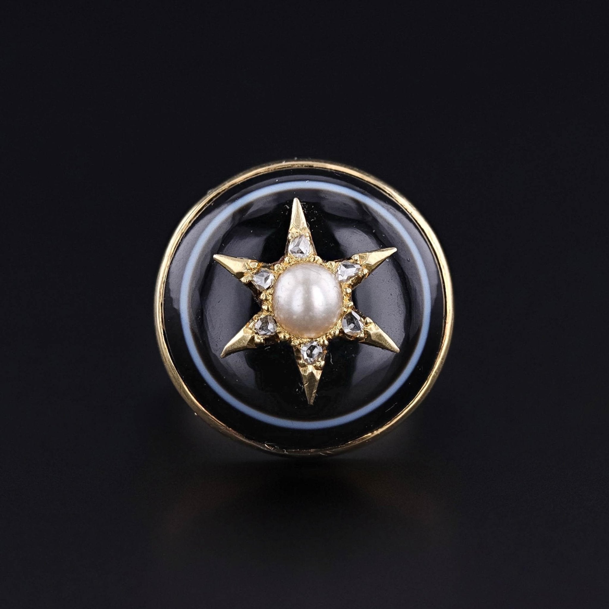This striking antique conversion ring features a luminous pearl and diamond star motif set atop a richly banded black agate. Originally an antique stickpin dating to circa 1870, the piece was thoughtfully transformed by our jeweler into a ring by removing the original pin and adding a custom 14k gold band. The result is a statement jewel that blends Victorian symbolism with timeless elegance.