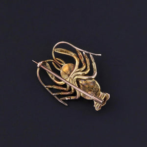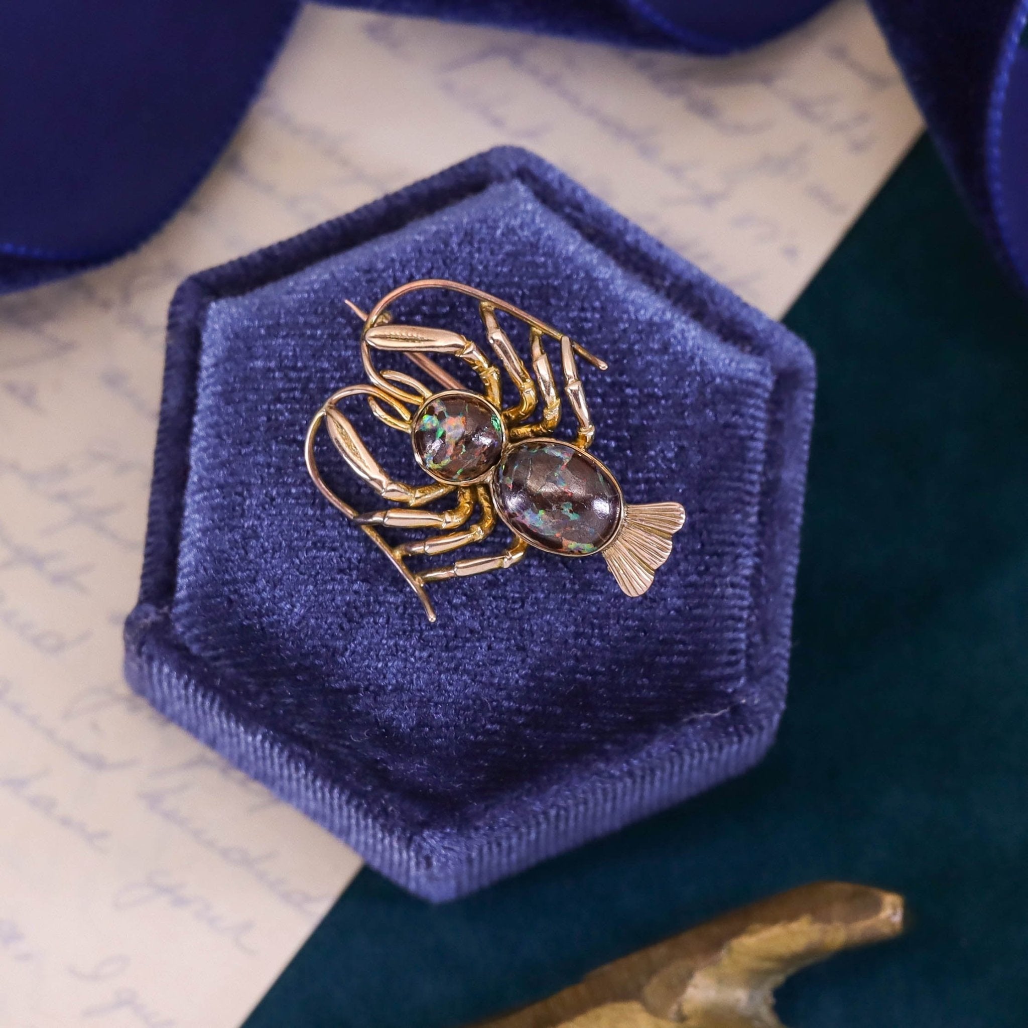 A rare and whimsical treasure, this antique brooch (circa 1900) takes the form of a finely detailed lobster, its body composed of shimmering boulder opals with flashes of iridescent color. The natural play of light in the opals beautifully captures the lifelike essence of the design, showcasing the imaginative artistry of turn-of-the-century jewelry.