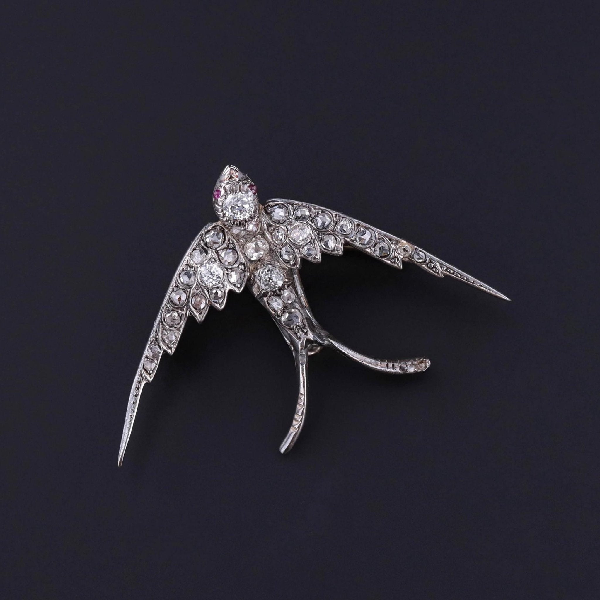 Graceful and symbolic, this antique swallow brooch dates to the late Victorian era (circa 1890). The swallow, a beloved motif of the period, represented loyalty, safe return, and enduring love — sentiments that made it a cherished jewel for travelers and sweethearts alike.
