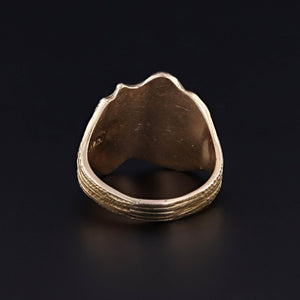 The face of the ring spans approximately 0.75 inches at its widest point, with graceful curves and fine detailing characteristic of the Art Nouveau movement’s love of naturalistic and mythical motifs. The gold has been confirmed through XRF and jeweler’s acid testing to ensure solid 14k purity.