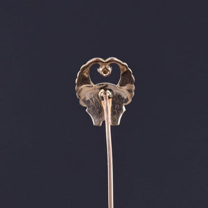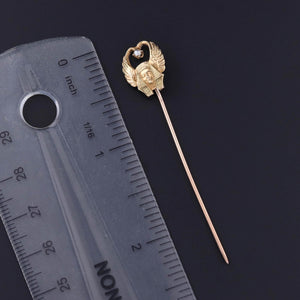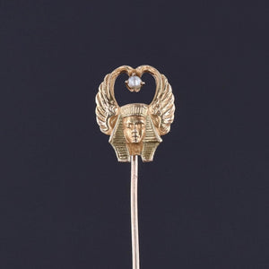 Exotic and symbolic, this antique stickpin (circa 1890–1910) depicts a finely detailed pharaoh’s head in 10k gold, flanked by stylized wings and accented with a luminous pearl. The design reflects the late Victorian and Edwardian fascination with Egyptian Revival jewelry, inspired by archaeology and the romance of ancient civilizations.