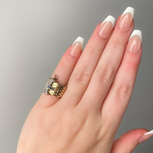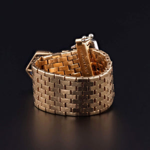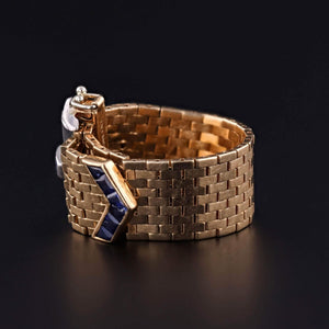 The gold has been authenticated through XRF (X-ray fluorescence) analysis and corroborated by jeweler’s acid testing, confirming its 14k composition. The ring is presented in good vintage condition—with only a few minor impressions in the mesh where the clasp attaches to the ring, some significant wear to the sapphires (visible under magnification), and a chip to one of the single channel set sapphires.