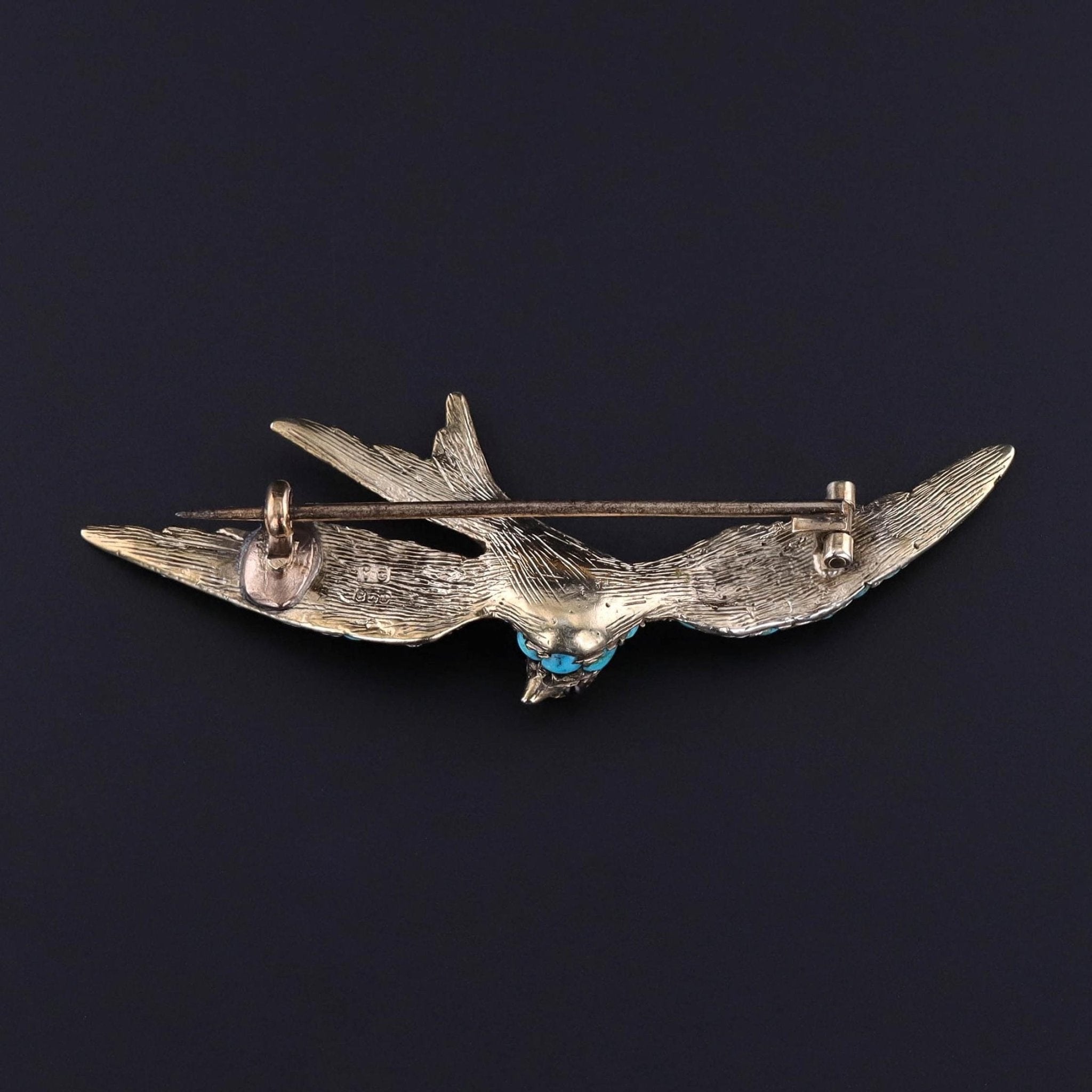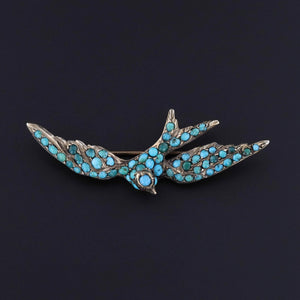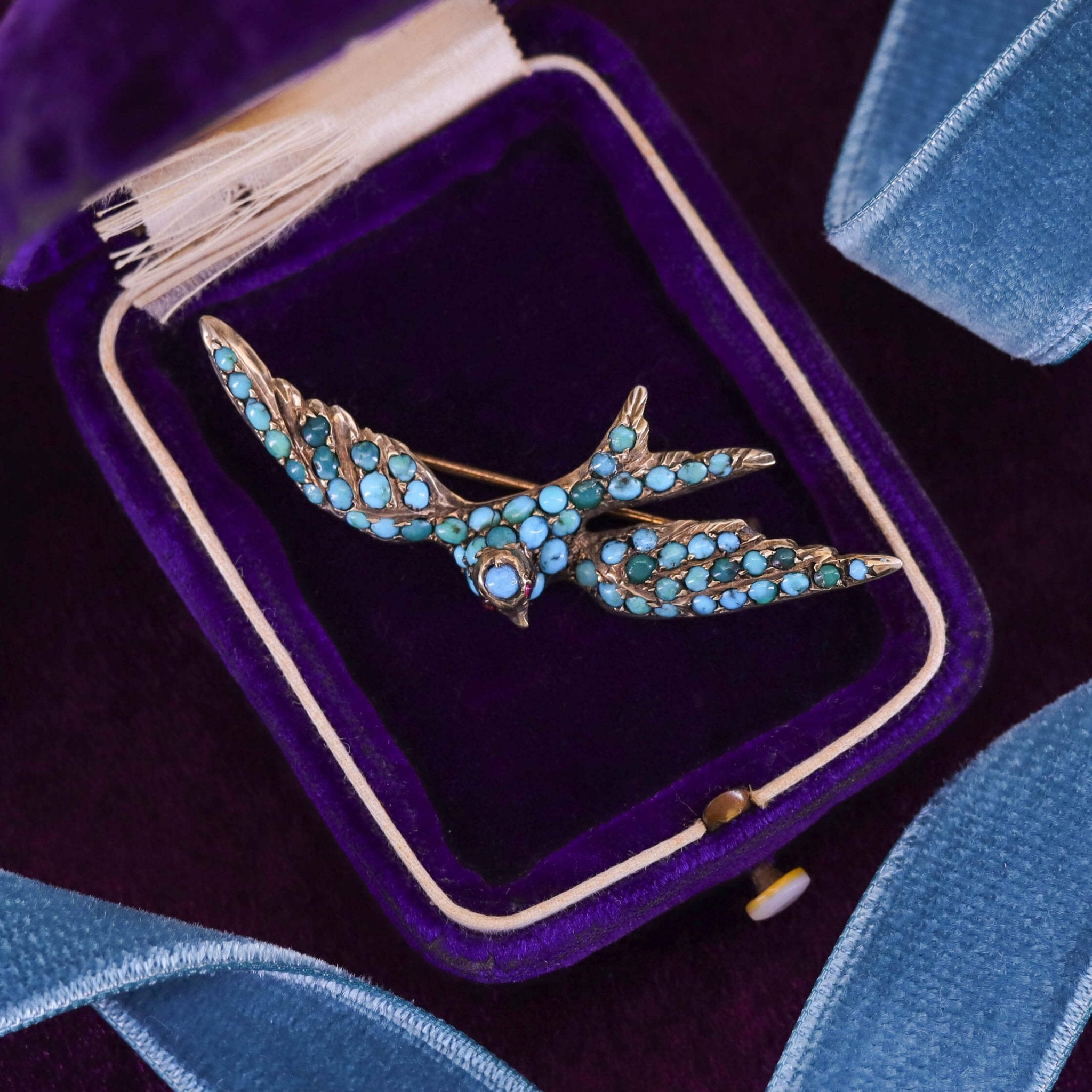 Swallows have long symbolized love, loyalty, and safe return, making them a cherished motif in Victorian jewelry. This finely crafted brooch captures that sentiment beautifully, featuring a graceful swallow adorned with vibrant turquoise cabochons and two fiery ruby eyes.