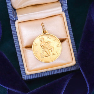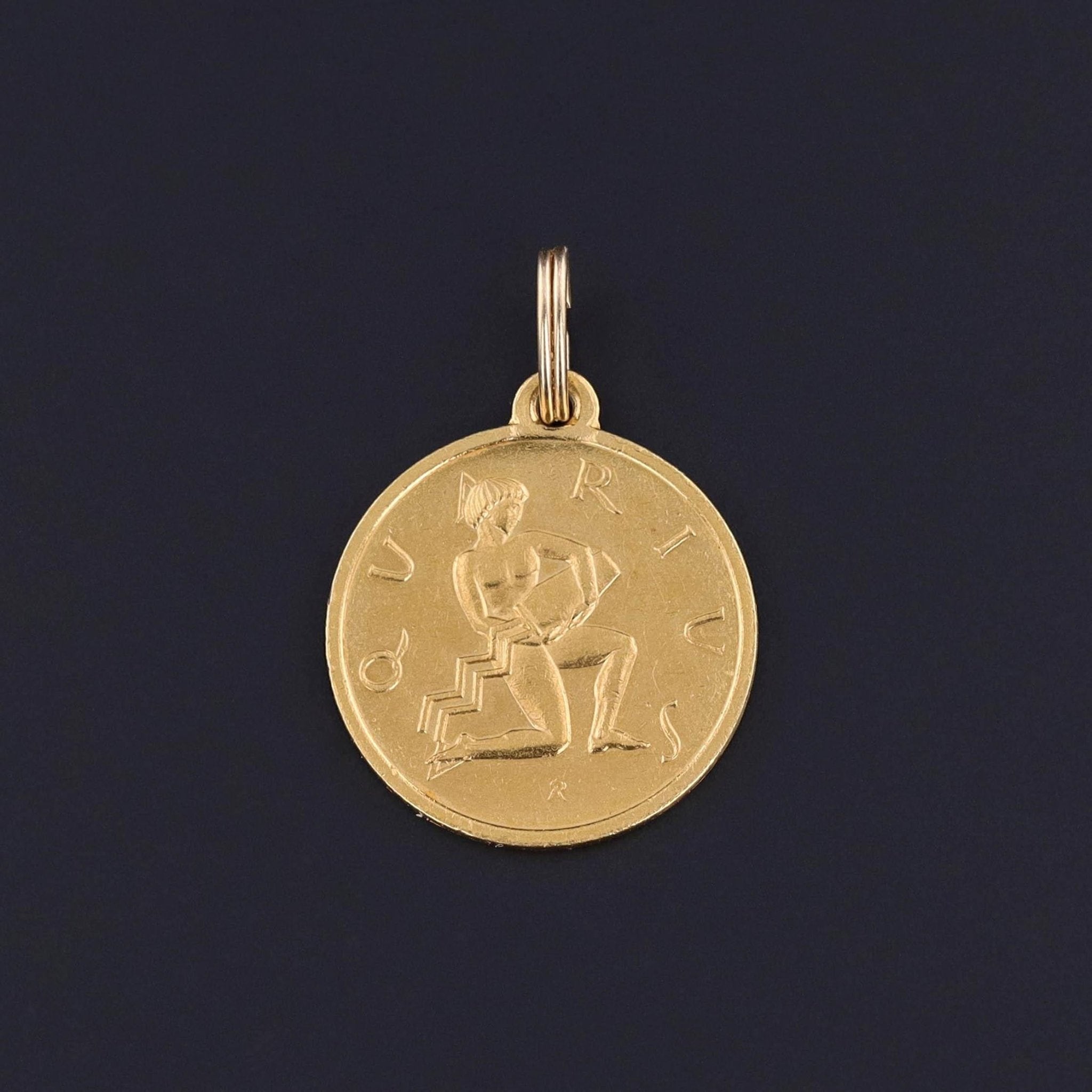 Sculptural and richly detailed, the figure is rendered in relief, framed in a classic circular design that balances mid-century minimalism with astrological elegance. Whether worn as a personal talisman or gifted to an Aquarian spirit, this pendant speaks to those who value both symbolic jewelry and refined vintage craftsmanship.