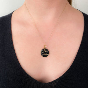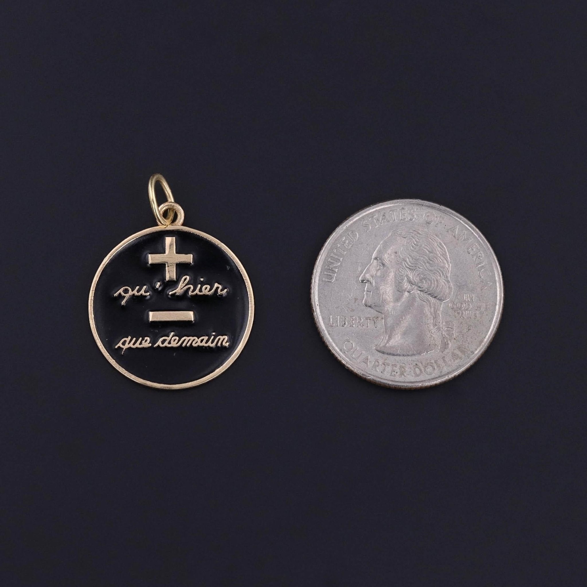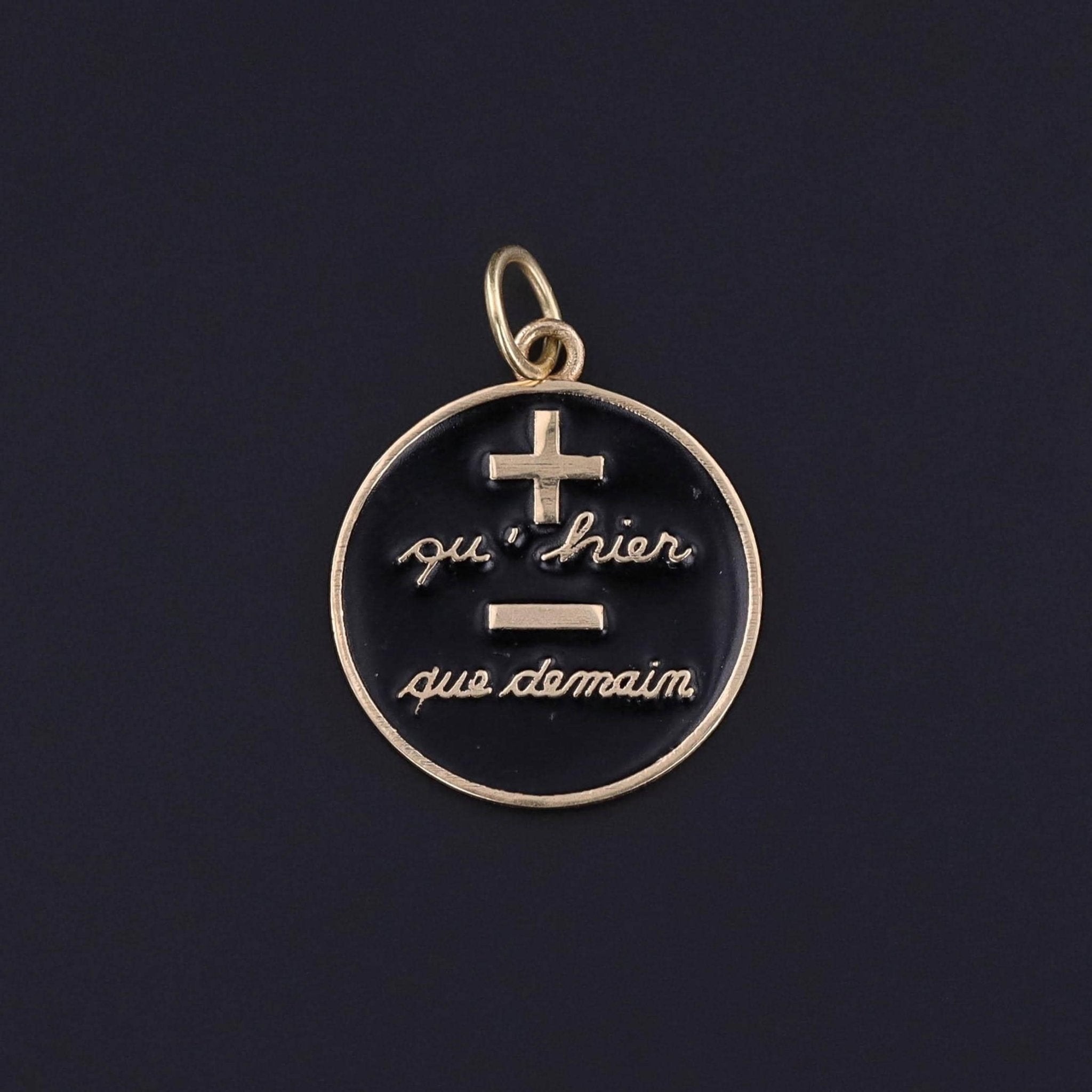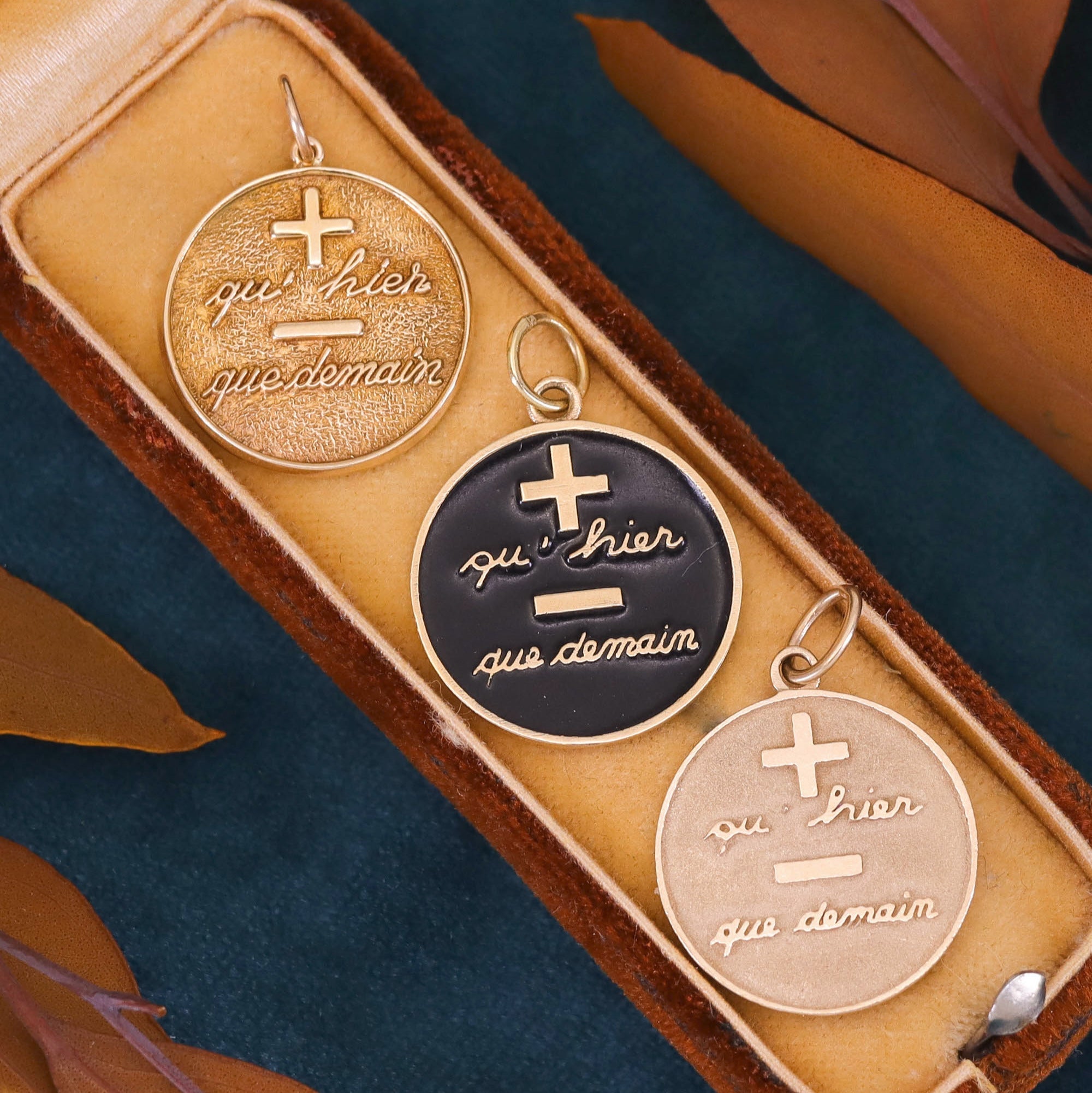 A timeless expression of enduring affection, this 14k gold pendant (circa 1980) features the romantic French inscription “Qu’Hier Que Demain”, flanked by a plus and minus symbol. Translated, it reads: “More than yesterday, less than tomorrow.” This tender phrase was inspired by a beloved line from the 19th-century French love poem by Rosemonde Gérard: