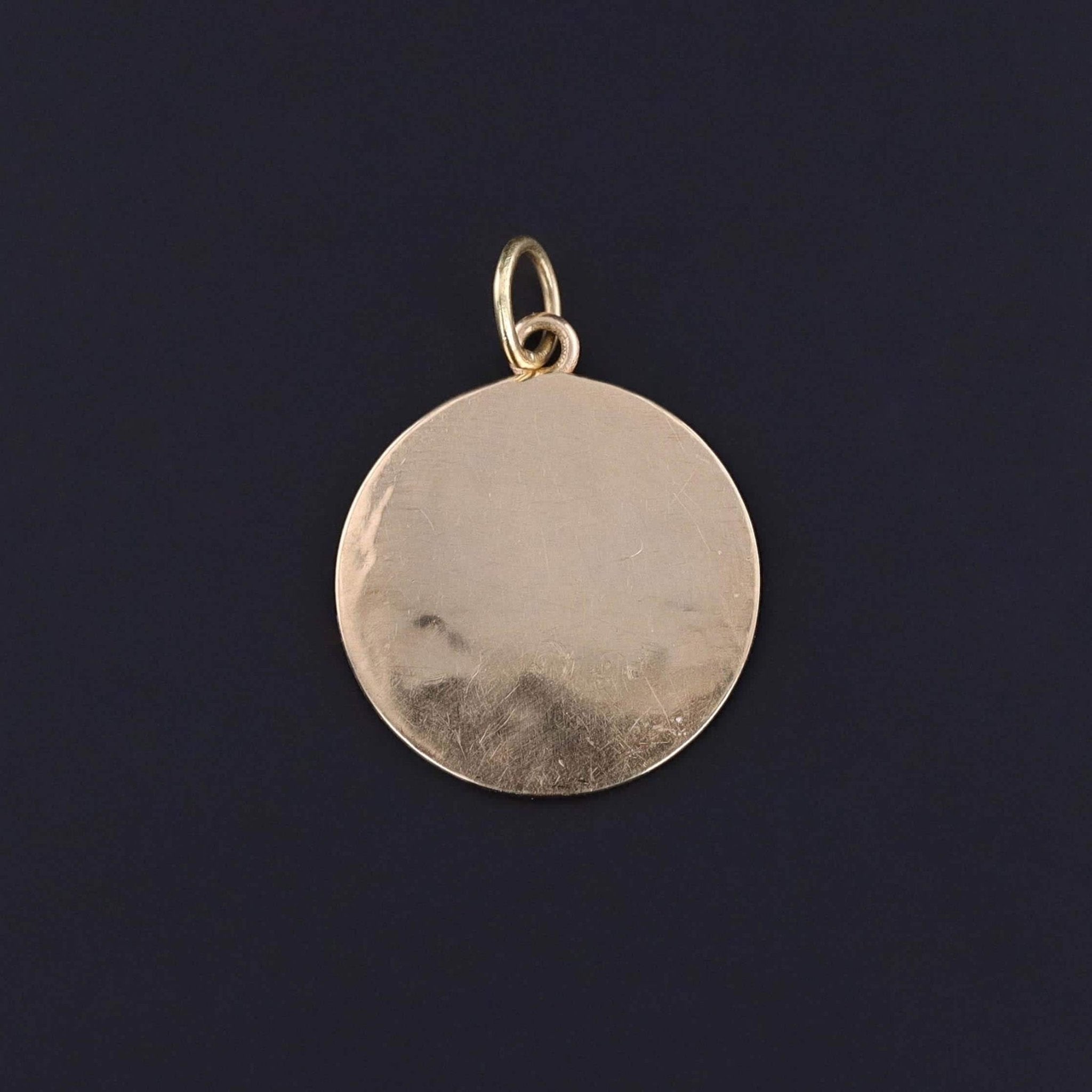 Crafted in solid 14k gold, the pendant measures approximately 1.1 inches from the top of the jump ring to the bottom and 0.8 inches wide, with a weight of 3.4 grams. It remains in excellent condition, with a clean, polished surface and crisp lettering.